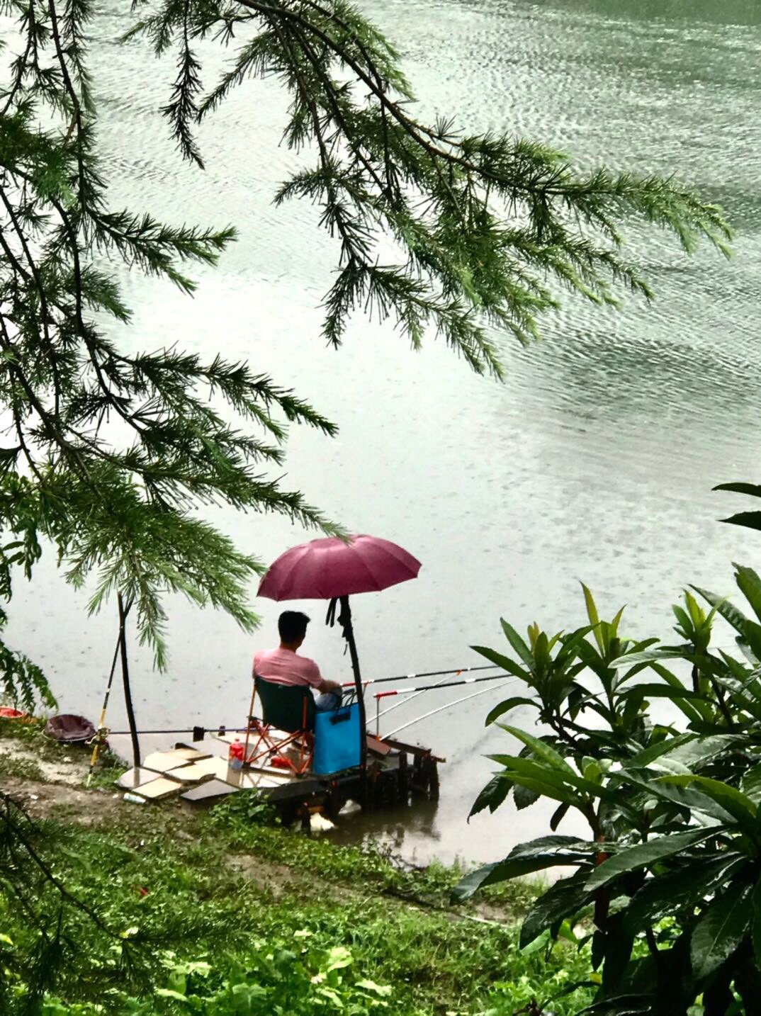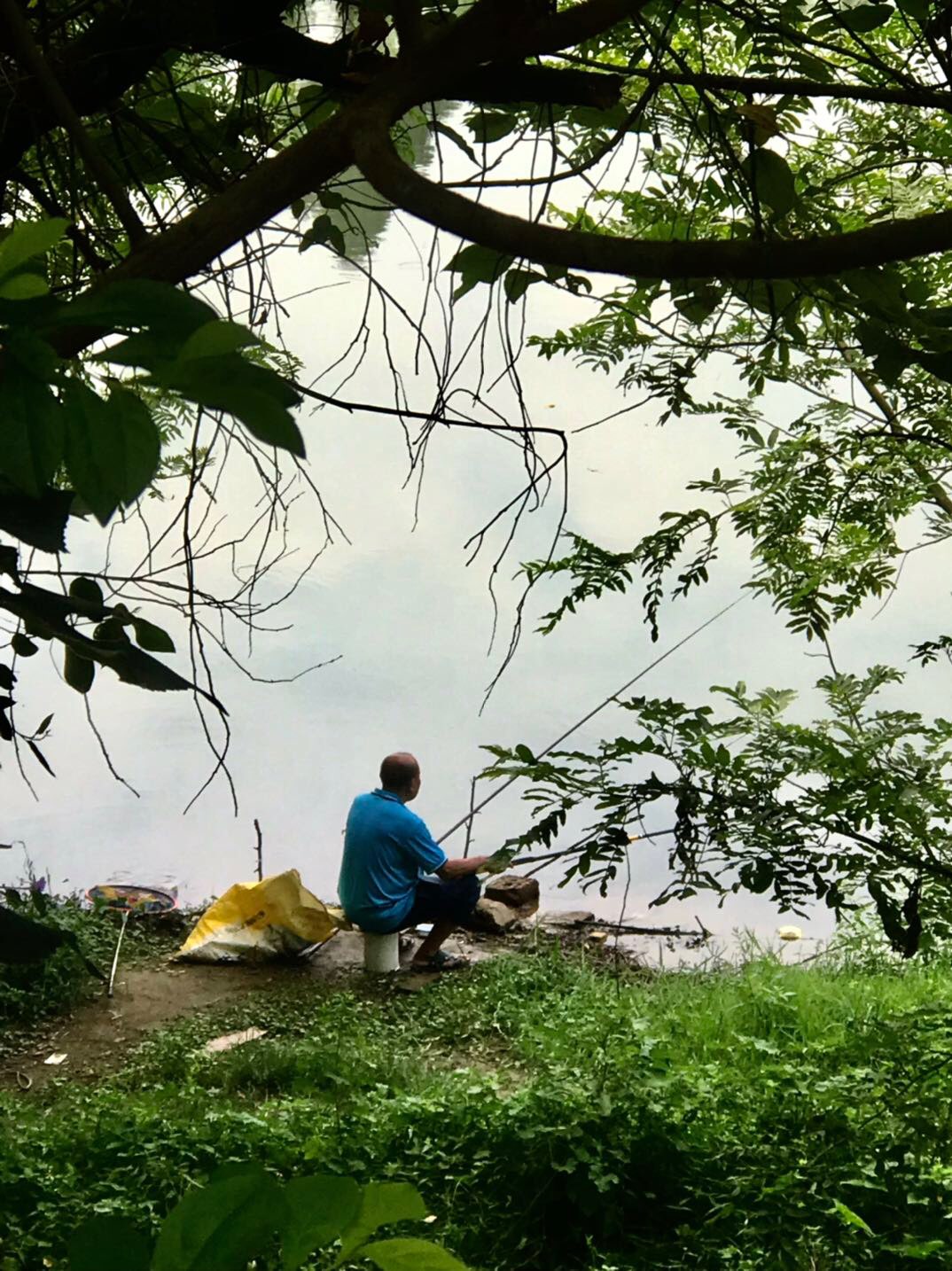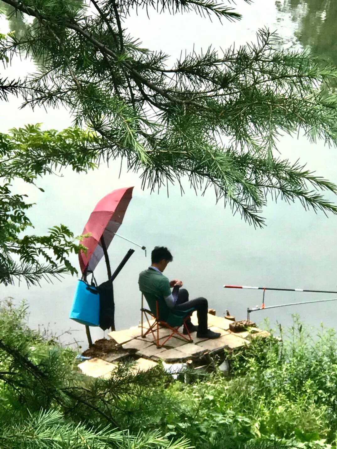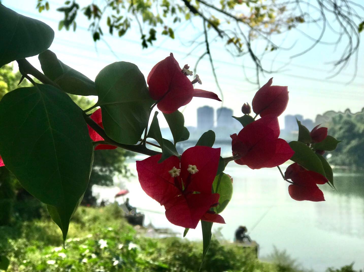 绿树,碧波,花下,悠闲垂钓人,犹如在画中。