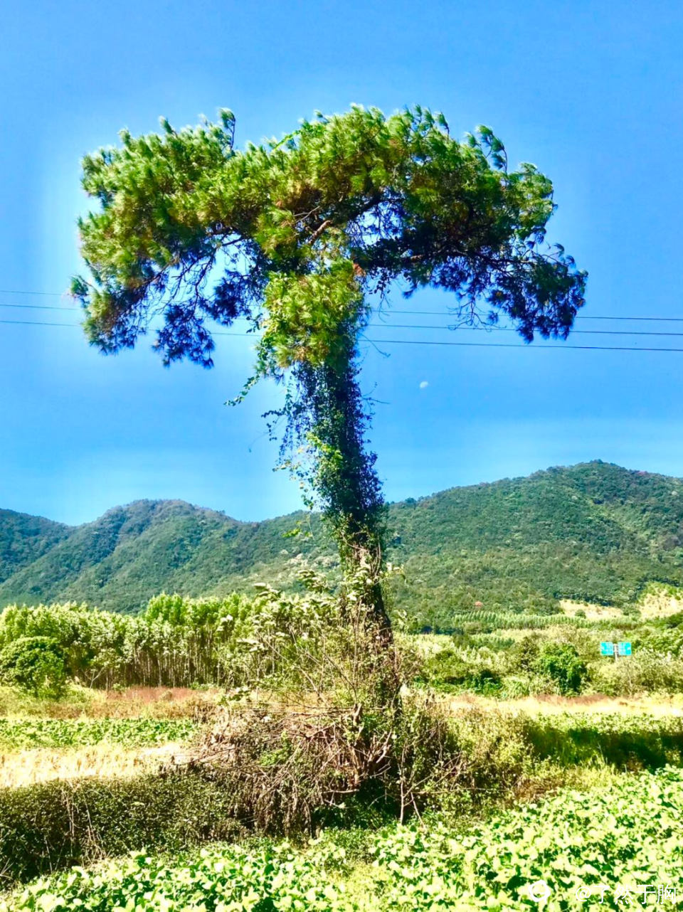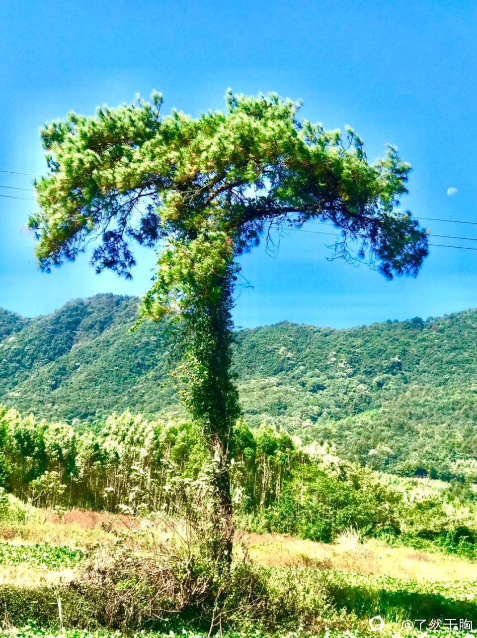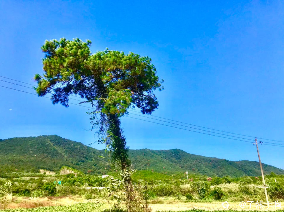秋高气爽,阳光和煦。漫步于原野田间,一棵孤松傲然立于田间,树干笔直,叶如伞盖。这或许就叫独美吧。