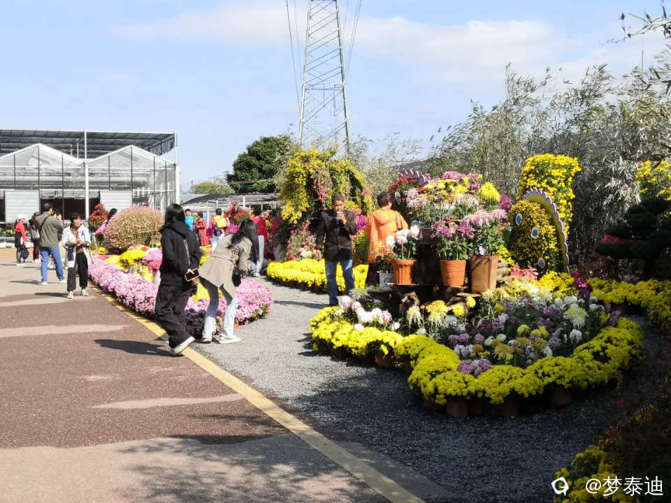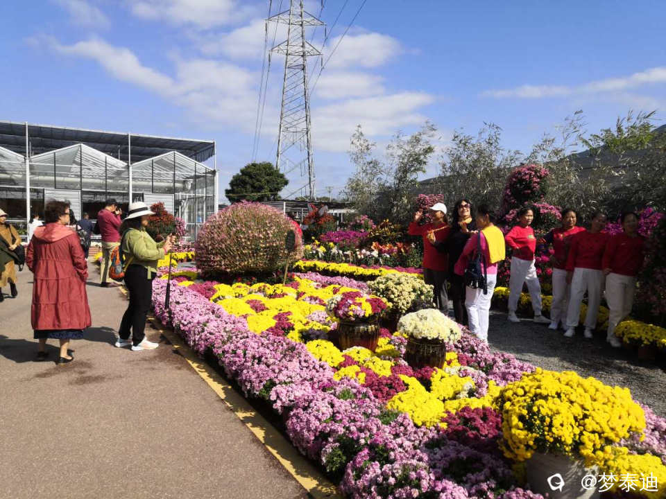 秋高气爽,蓝天白云,菊花展有很多市民游客参观,还有专程开车来赏花买花的市民,现场很热闹。