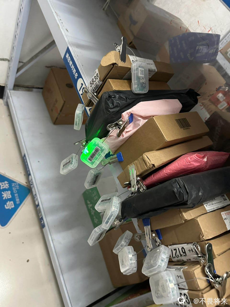他不信邪,走进菜鸟驿站后,四面八方传来滴滴滴的声音,一堆人围着工作人员在问,需要先扫码,不管在哪个平台买的,只需要打开淘宝扫码都能查询到(很好奇怎么做到的),手机上一键点亮,你的快递就会发出绿色的光呼叫你,每个快递上夹一个夹子。