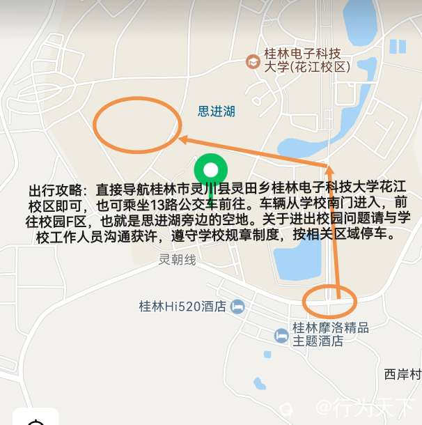 出行攻略:直接导航桂林市灵川县灵田乡桂林电子科技大学花江校区即可,也可乘坐13路公交车前往。车辆从学校南门进入,前往校园F区,也就是思进湖旁边的空地。关于进出校园问题请与学校工作人员沟通获许,遵守学校规章制度,按相关区域停车。