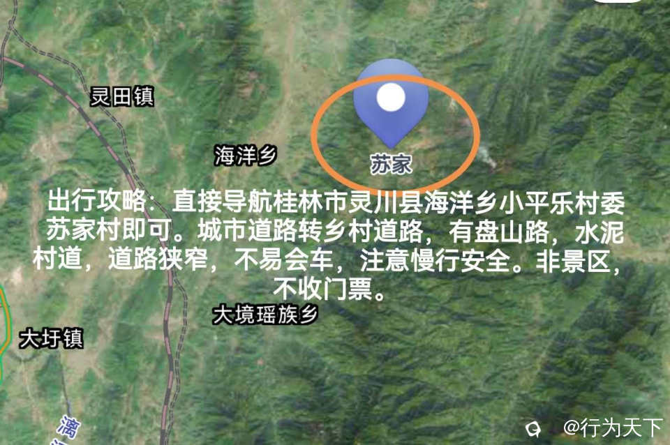 出行攻略:直接导航桂林市灵川县海洋乡小平乐村委苏家村即可。城市道路转乡村道路,有盘山路,水泥村道,道路狭窄,不易会车,注意慢行安全。非景区,不收门票。