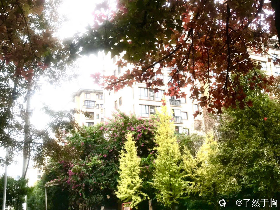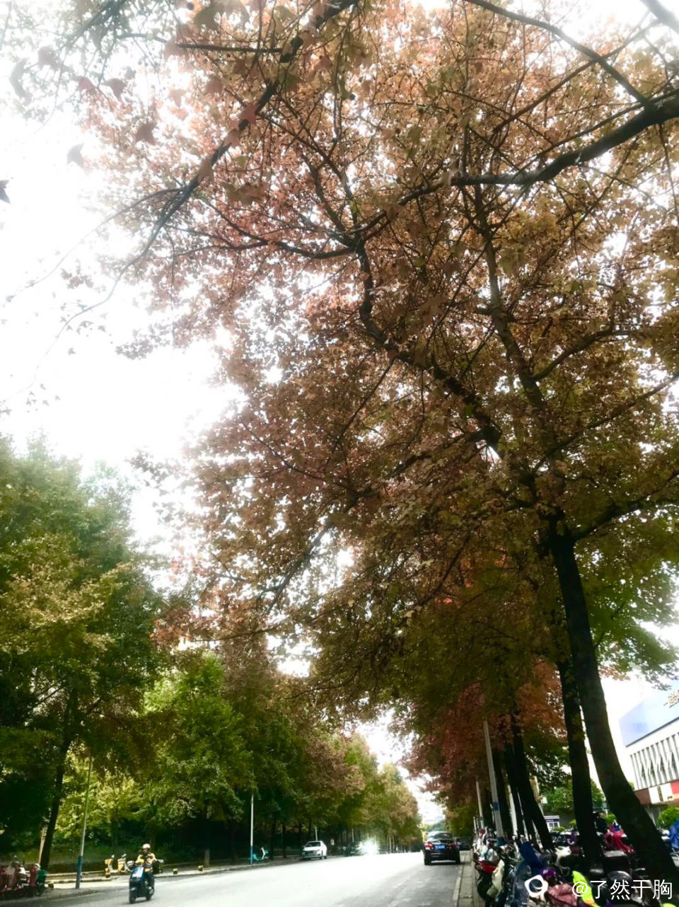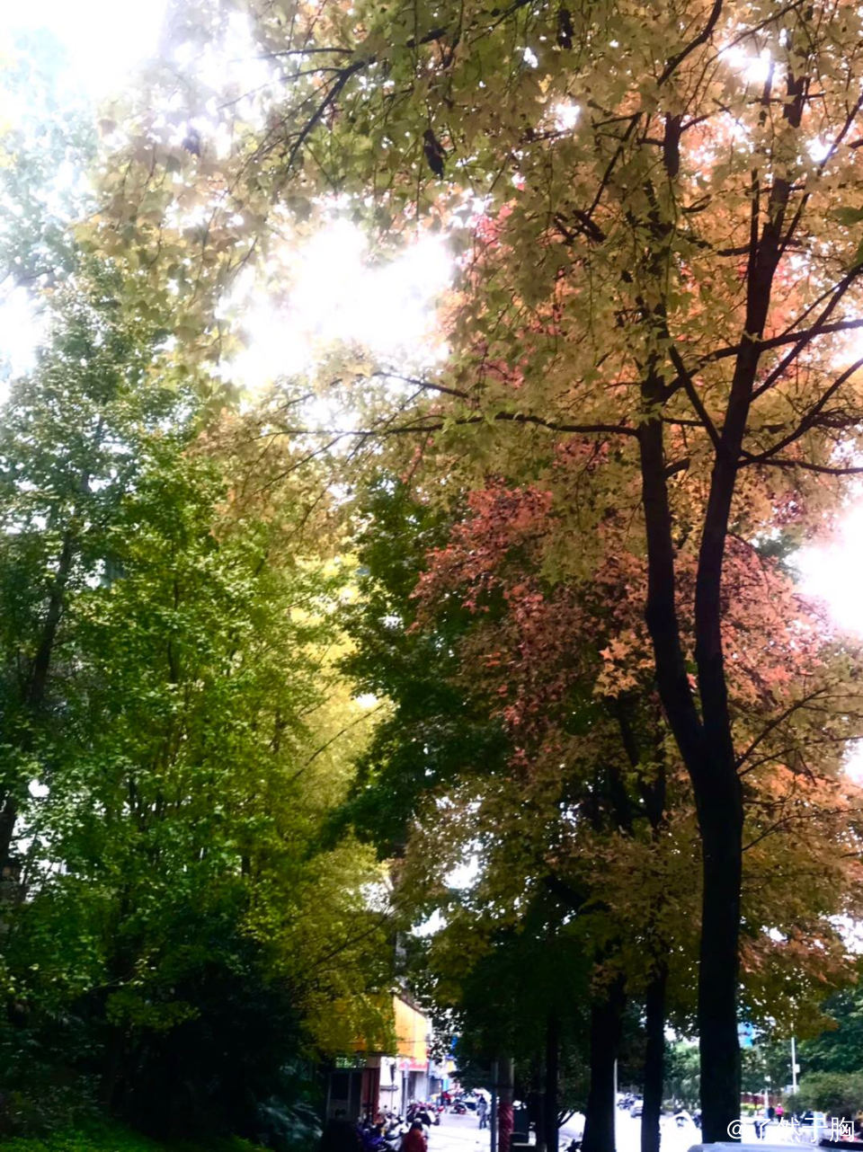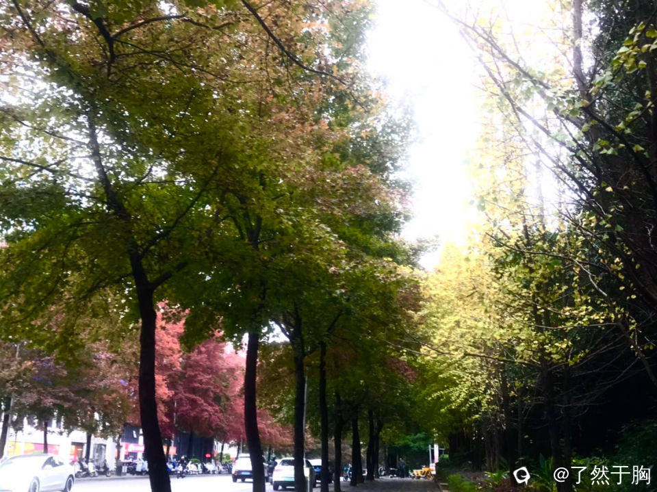 在寒风冷雨中,理店路上的枫树,已是渐次火红,而夹杂其旁的银杏树,树叶早已金黄。