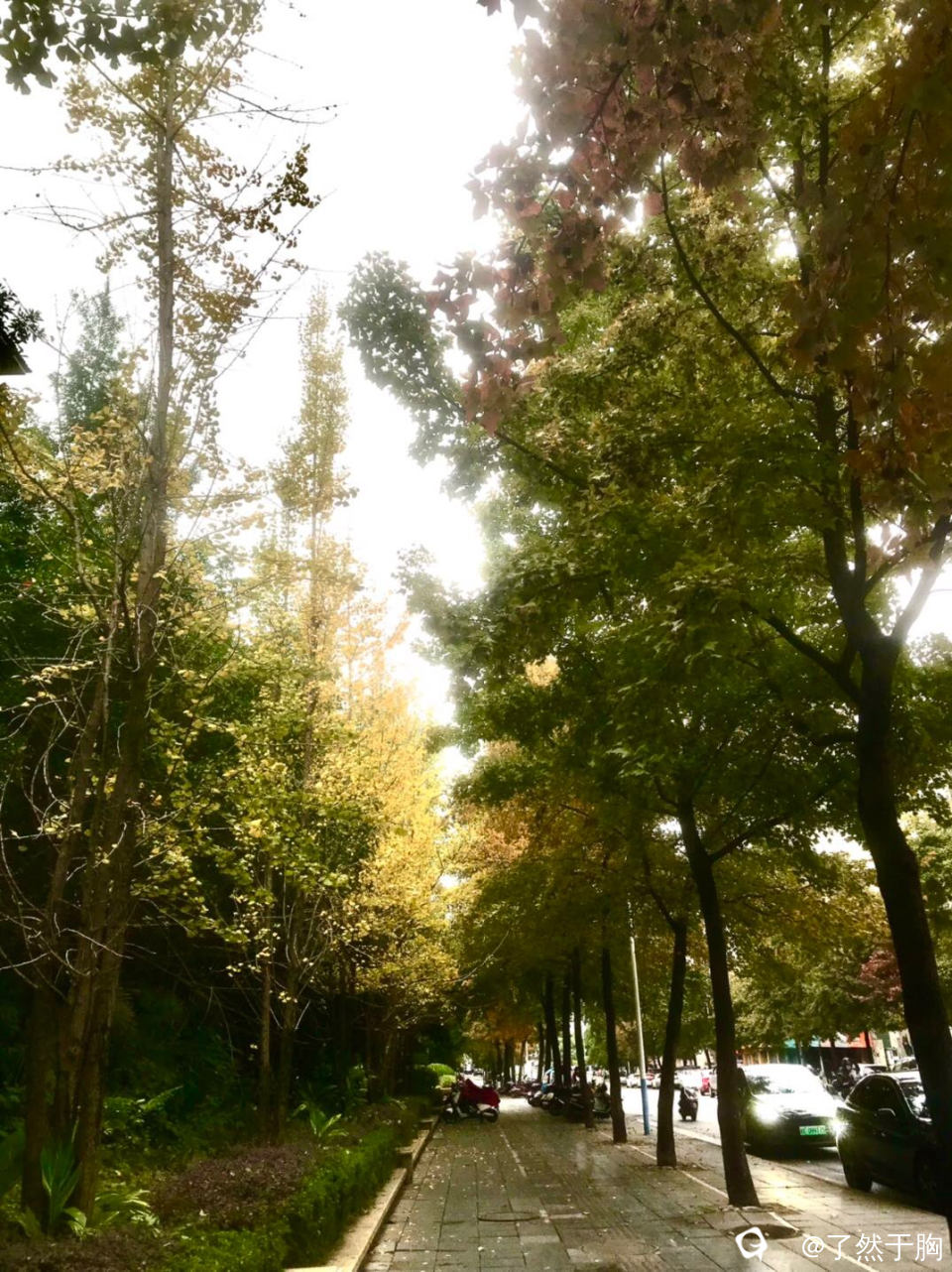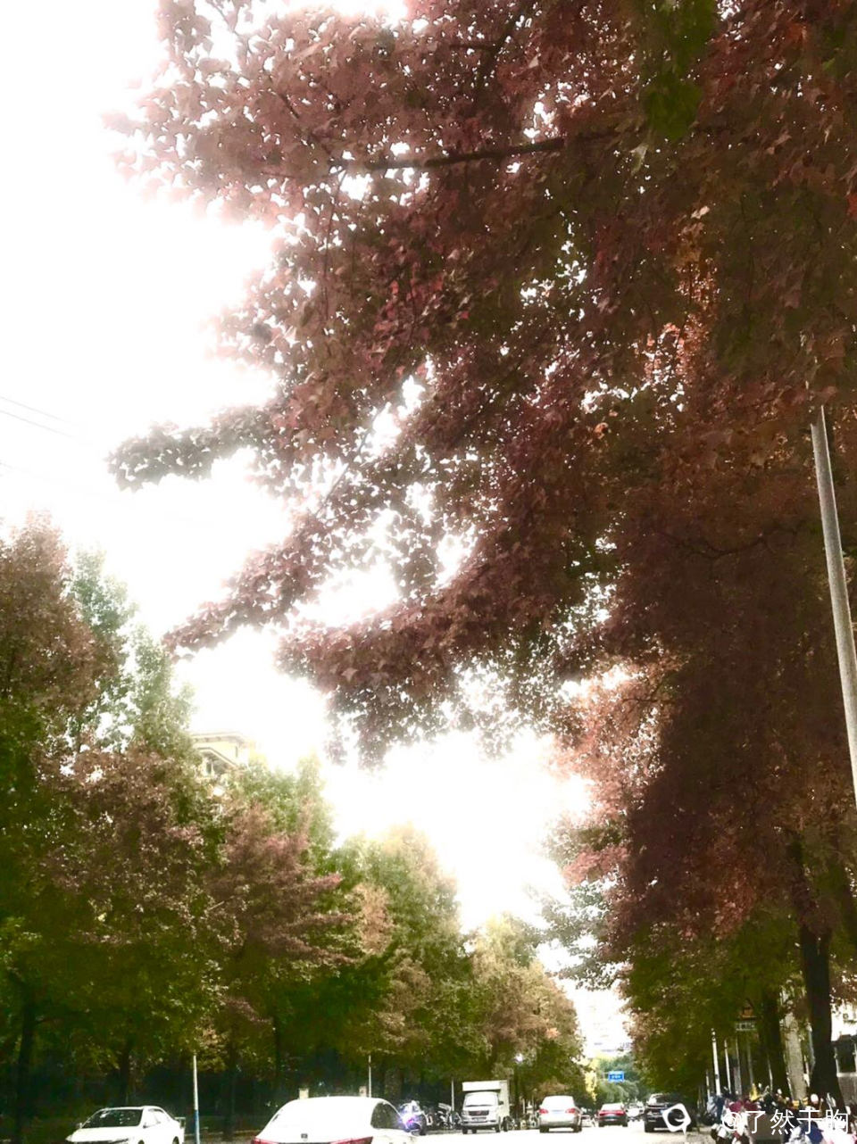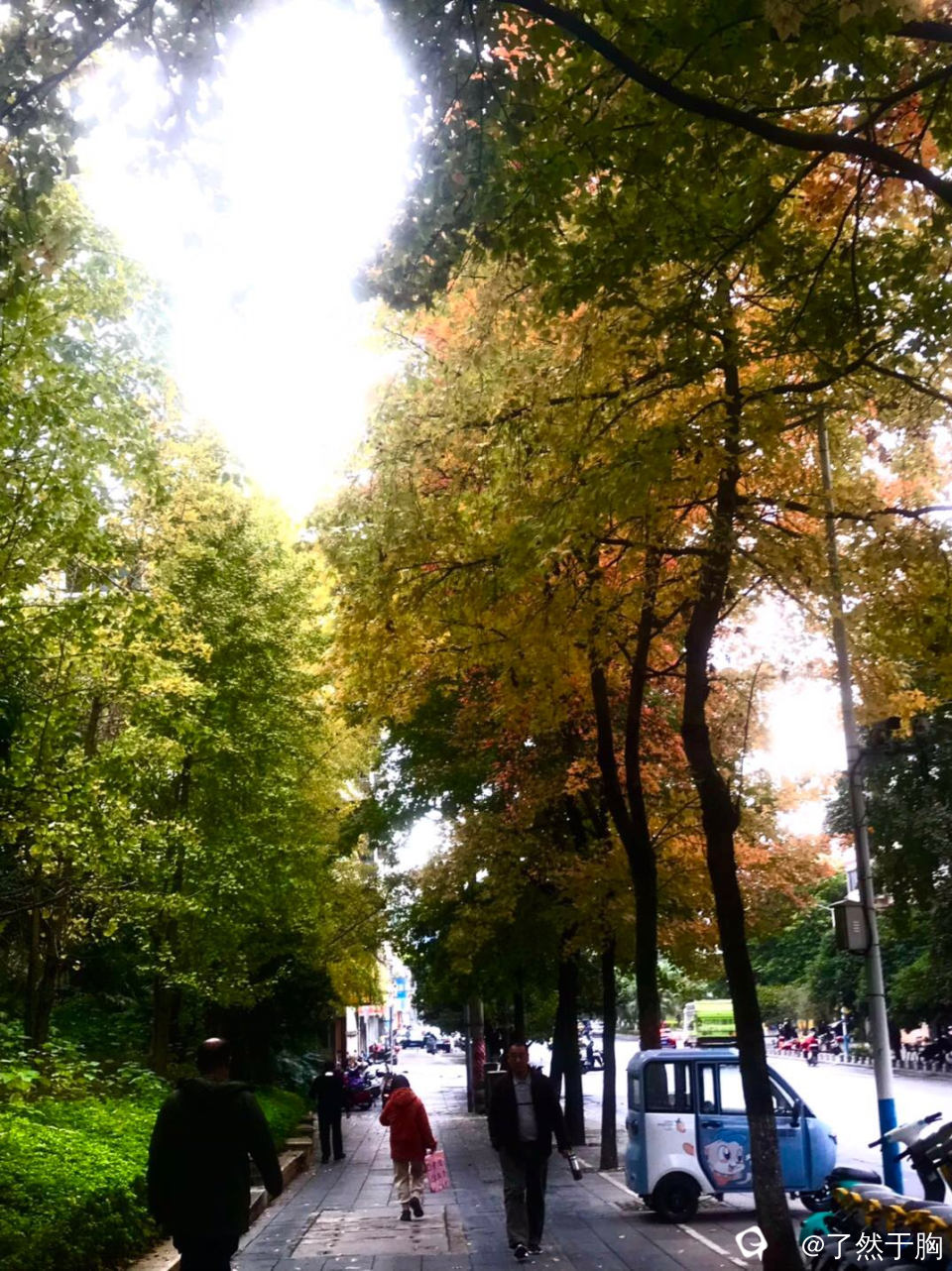 在寒风冷雨中,理店路上的枫树,已是渐次火红,而夹杂其旁的银杏树,树叶早已金黄。