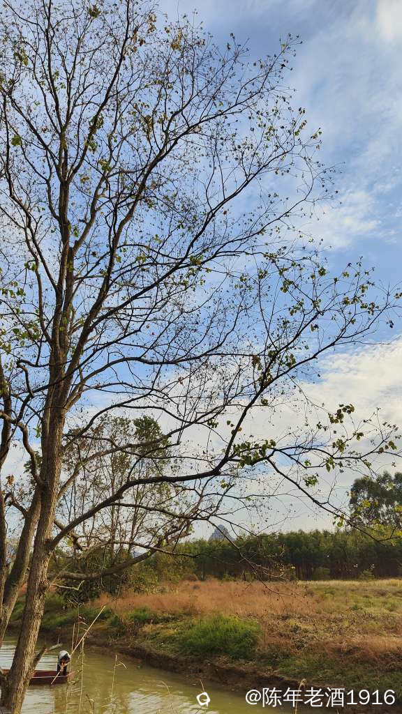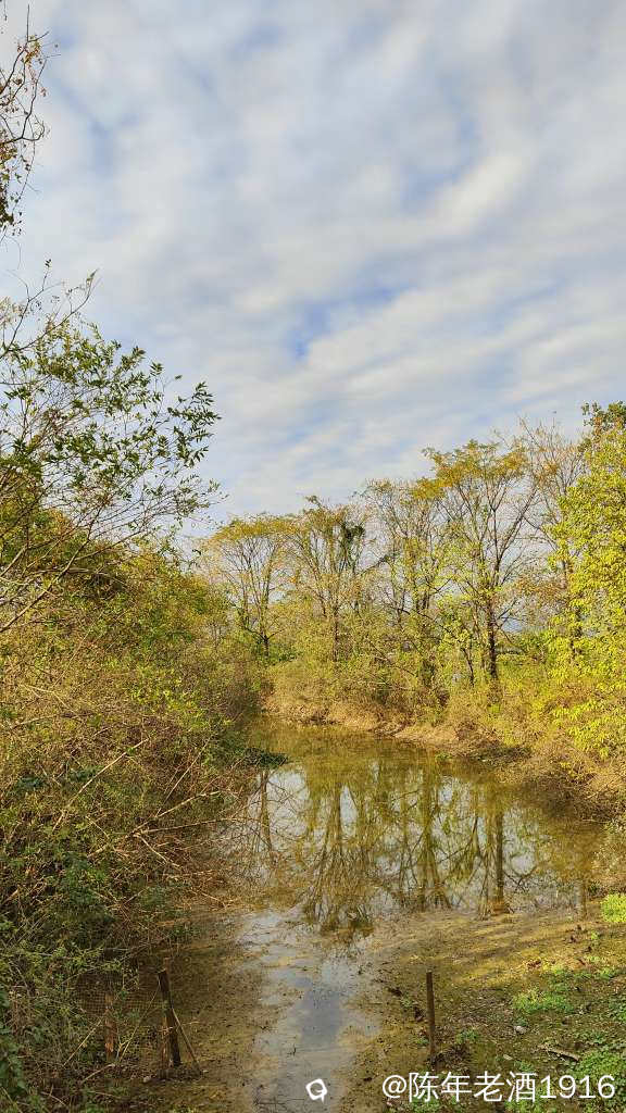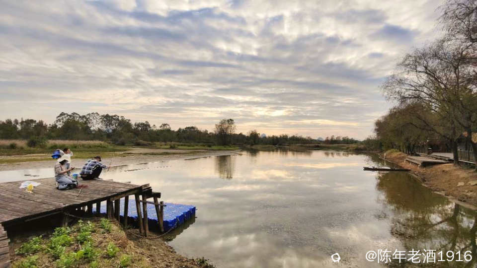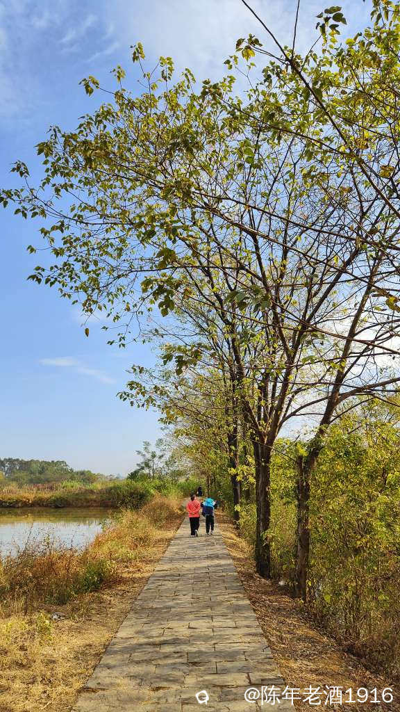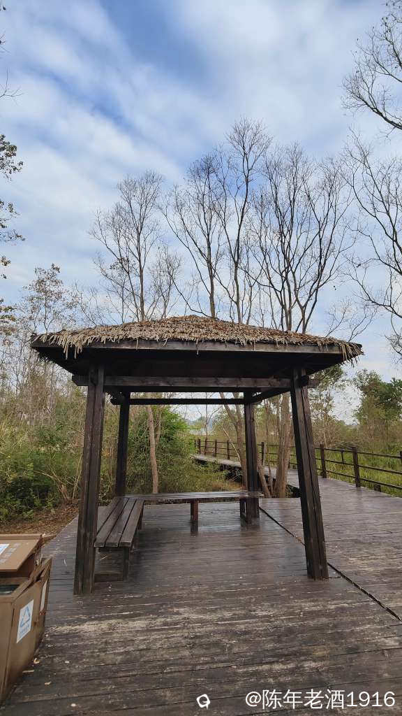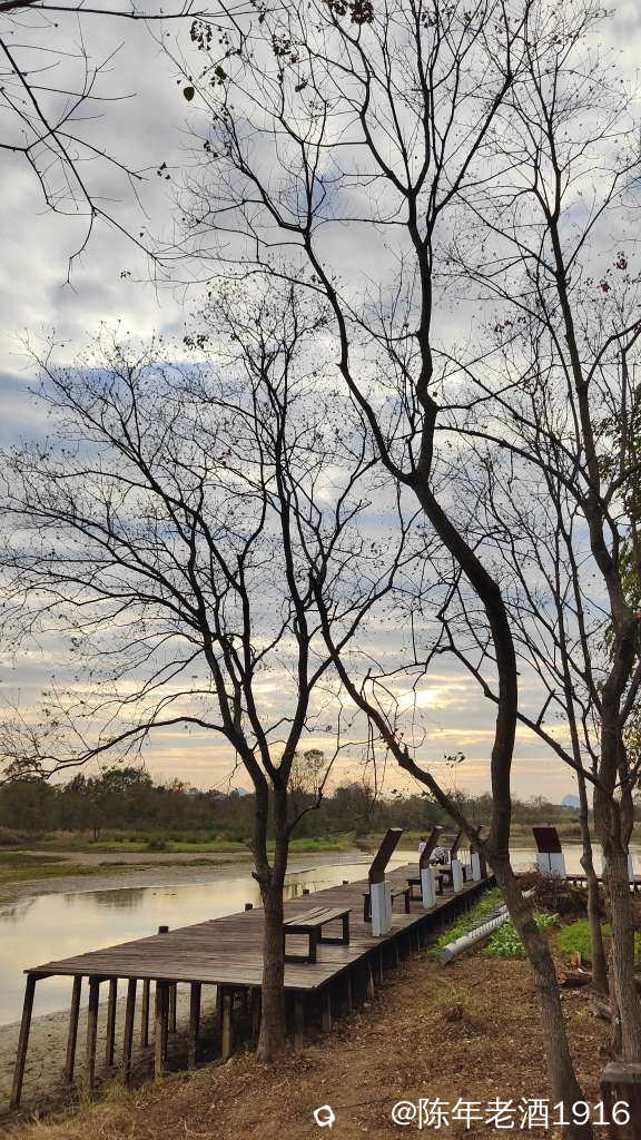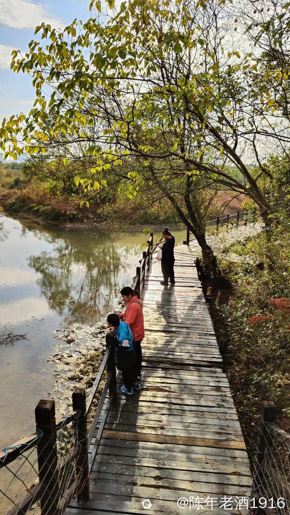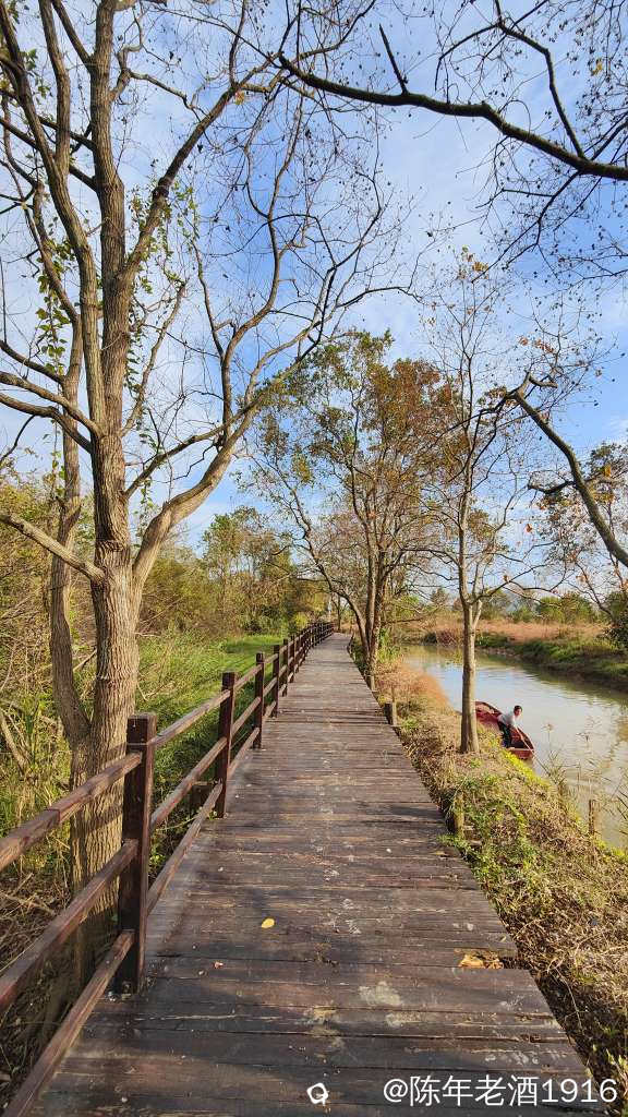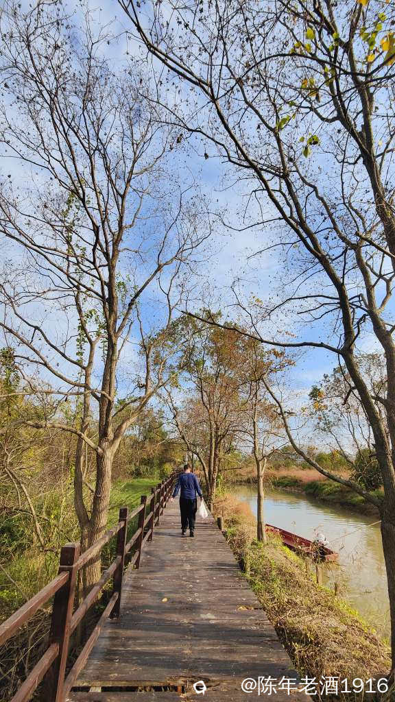 除了有几辆车在旁边的鱼塘钓鱼外,没什么人来耍。其实我也是想来看看这里的乌桕树叶子到底红了没有。先到乾隆桥这头,有一对情侣在桥边钓鱼,看到步道老化损毁较为严重,真担心会踩塌了,于是蹑手蹑脚的往里走了一段,步道两旁的乌桕树光秃秃的,叶子几乎落光,水沟里有个大嫂在捞螺蛳,直到前面提示禁止通行才打转出来,由于久未下雨,湿地好多地方都干旱无水,也许乌桕叶也是干旱导致叶子没红就落光了吧。