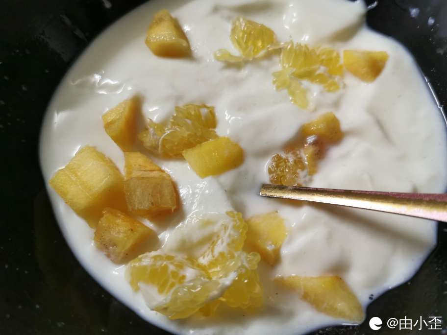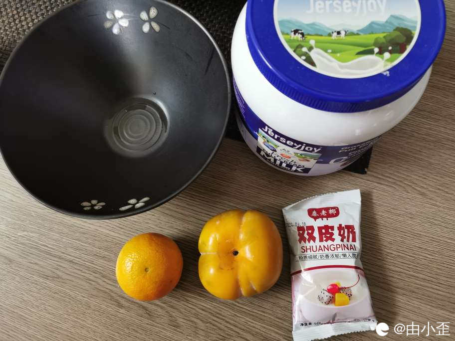 取一包双皮奶粉、早餐奶粉、橘子柿子(家里水果有啥用啥)。