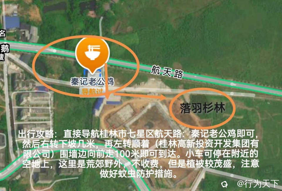 出行攻略:直接导航桂林市七星区航天路:秦记老公鸡即可,然后右转下坡几米,再左转顺着(桂林高新投资开发集团有限公司)围墙边向前走100米即可到达。