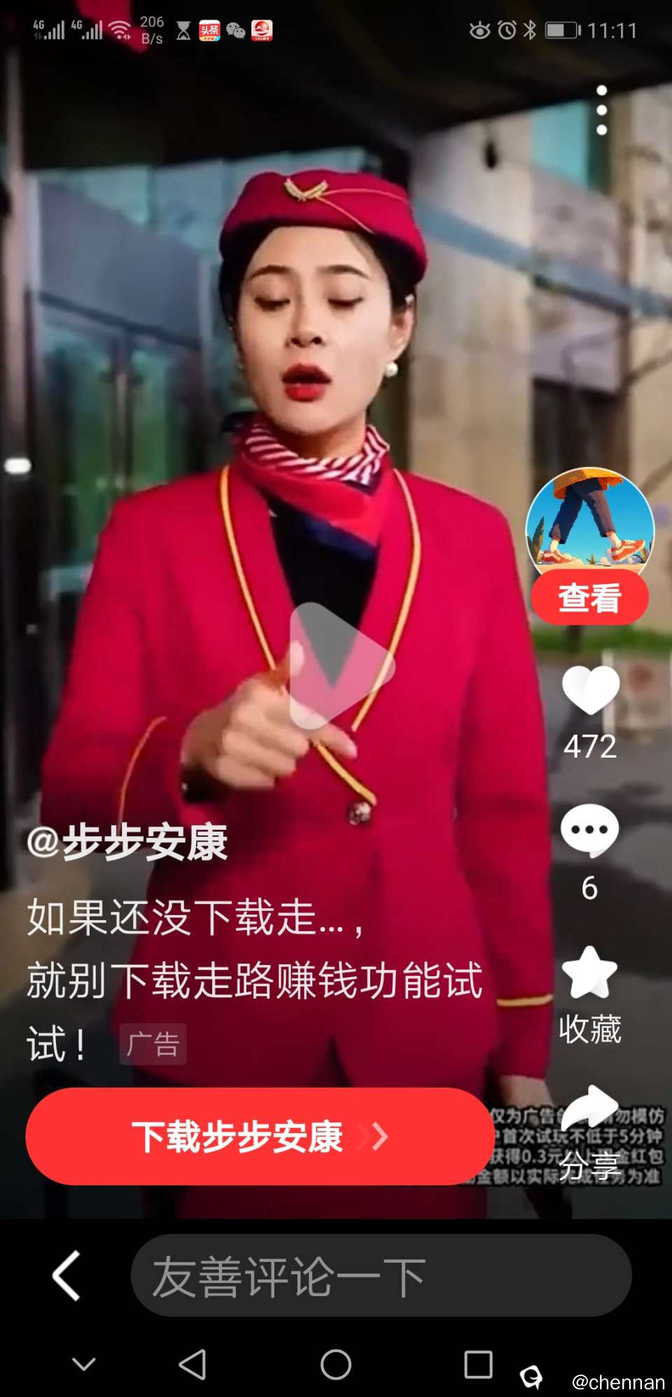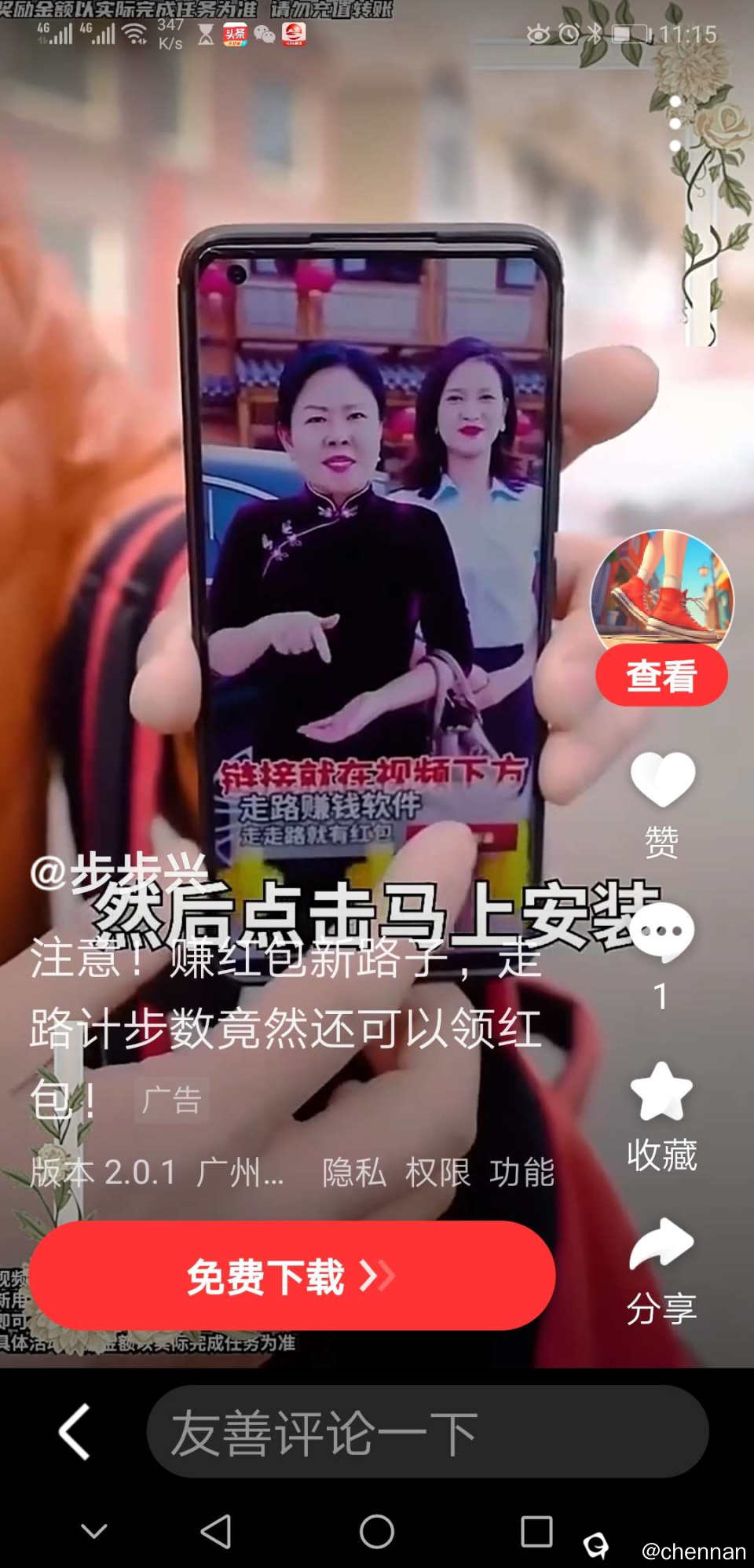 这几天刷手机,不断的出现这种视频:就是叫你下载一个软件,可以走路赚钱。刚看视频的时候,还有点半信半疑,后来视频以不同方式不断出现,这种轰炸式的广告,让人不得不怀疑这是一个骗局。