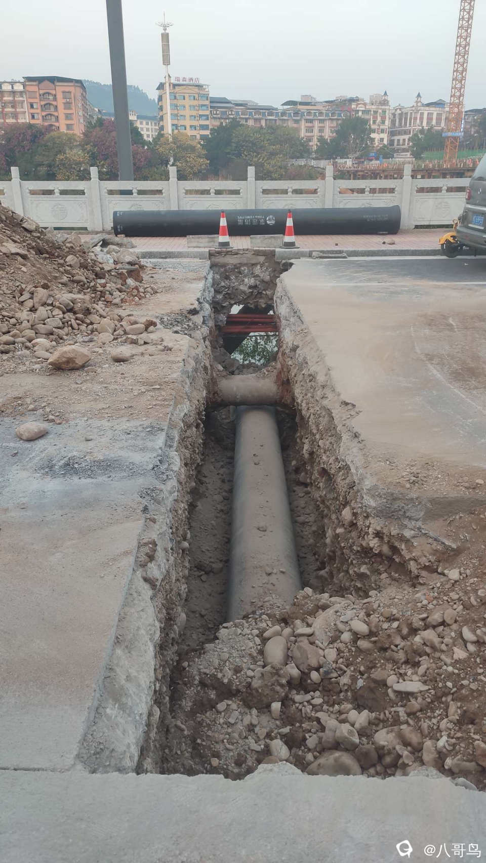 前段时间碧水湾沿江路动手术不知道是做什么,现在可以看得出来了,放管子是接以前埋在江底那根水管的。现在看见管子分叉出来有消防取水口的。