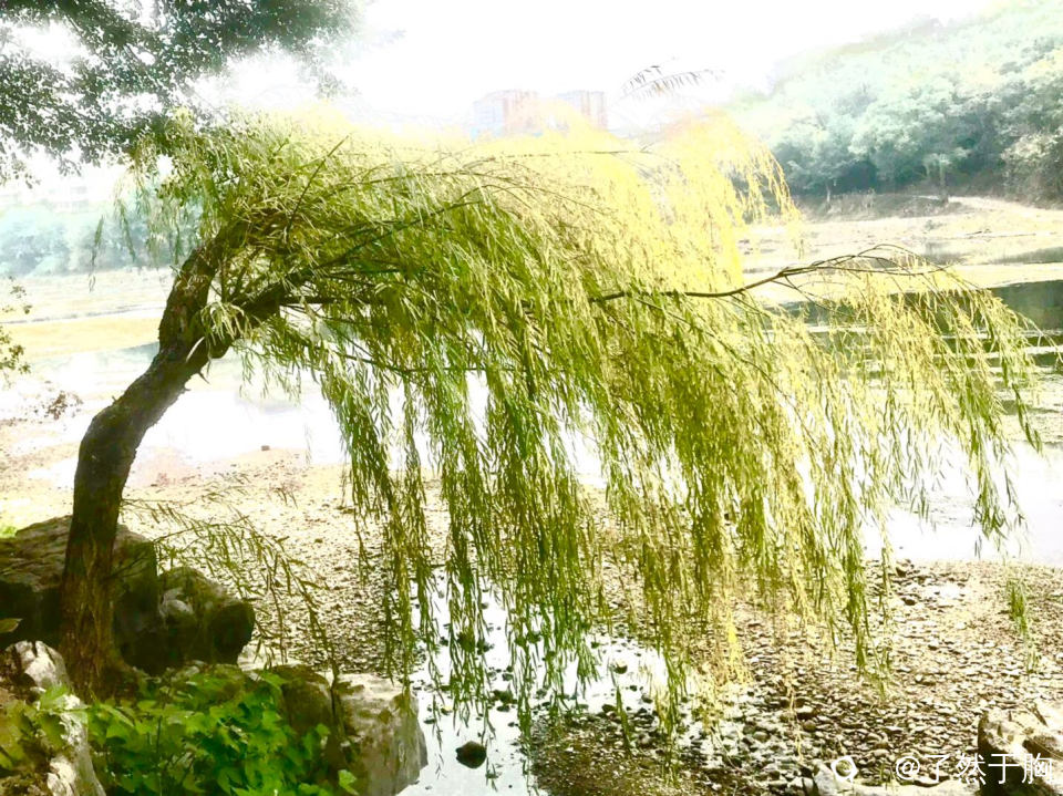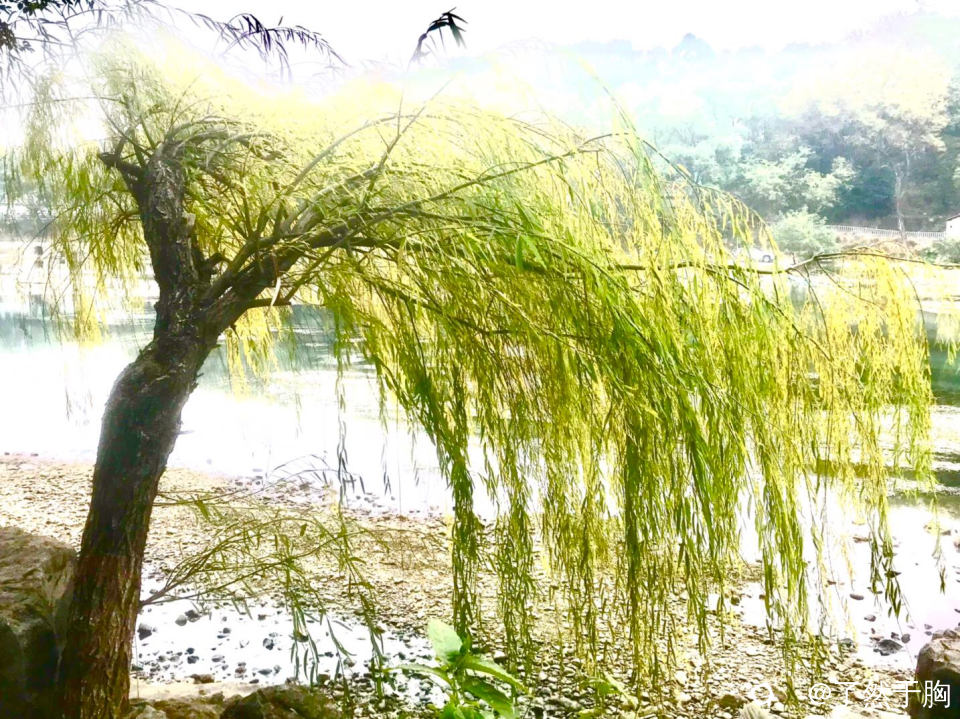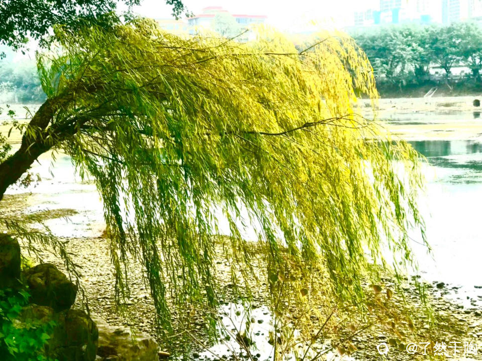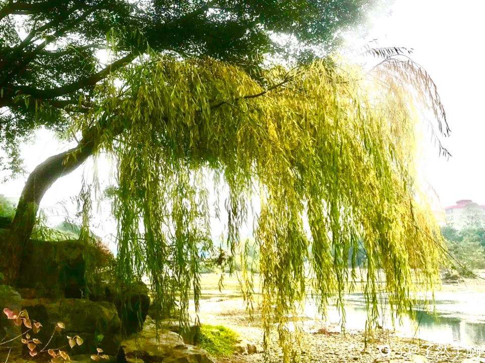 寒冬时节,柳叶渐黄,柳枝如帘,树干弯曲,形成了一道独特的美景。