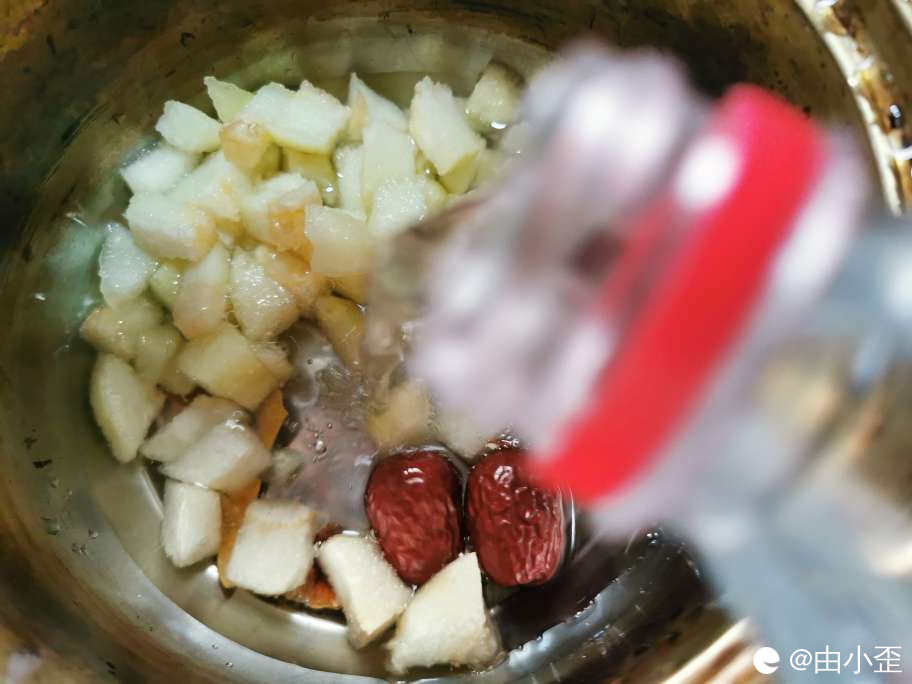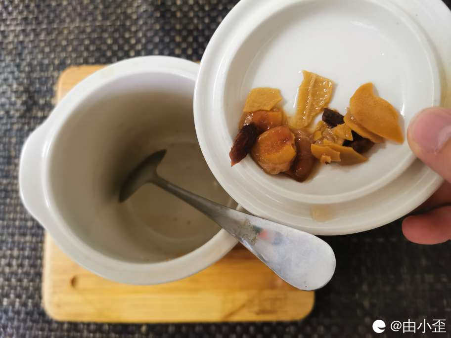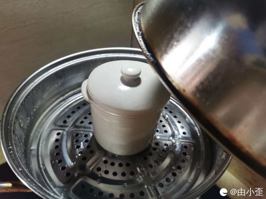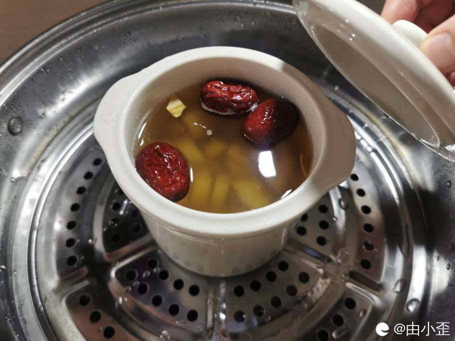 水开后转到小胆炖盅,再倒黄糖(别问了,家里没有冰糖,冰糖应该效果更佳),小火慢炖25分钟
