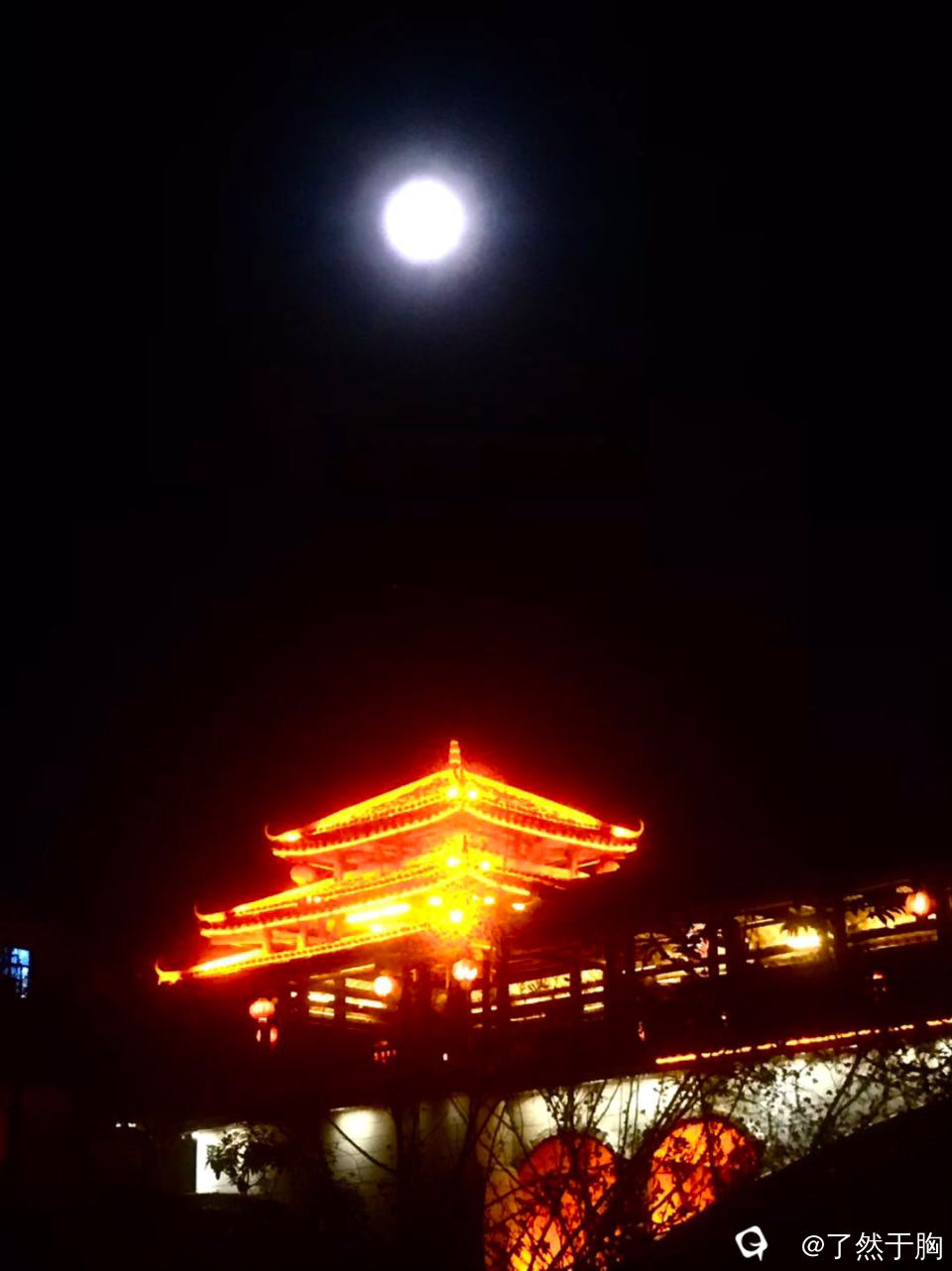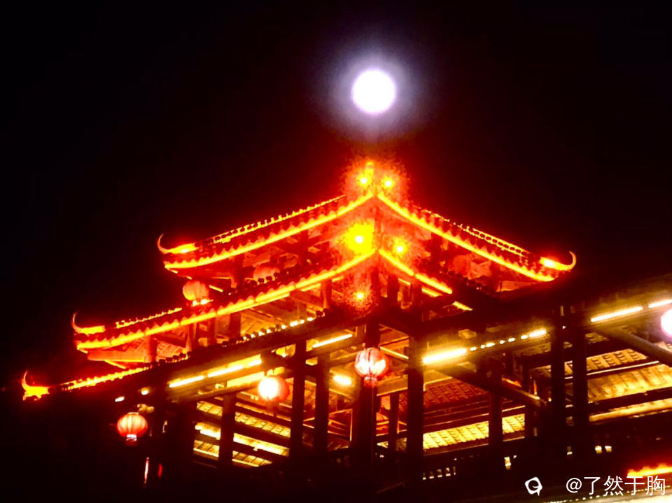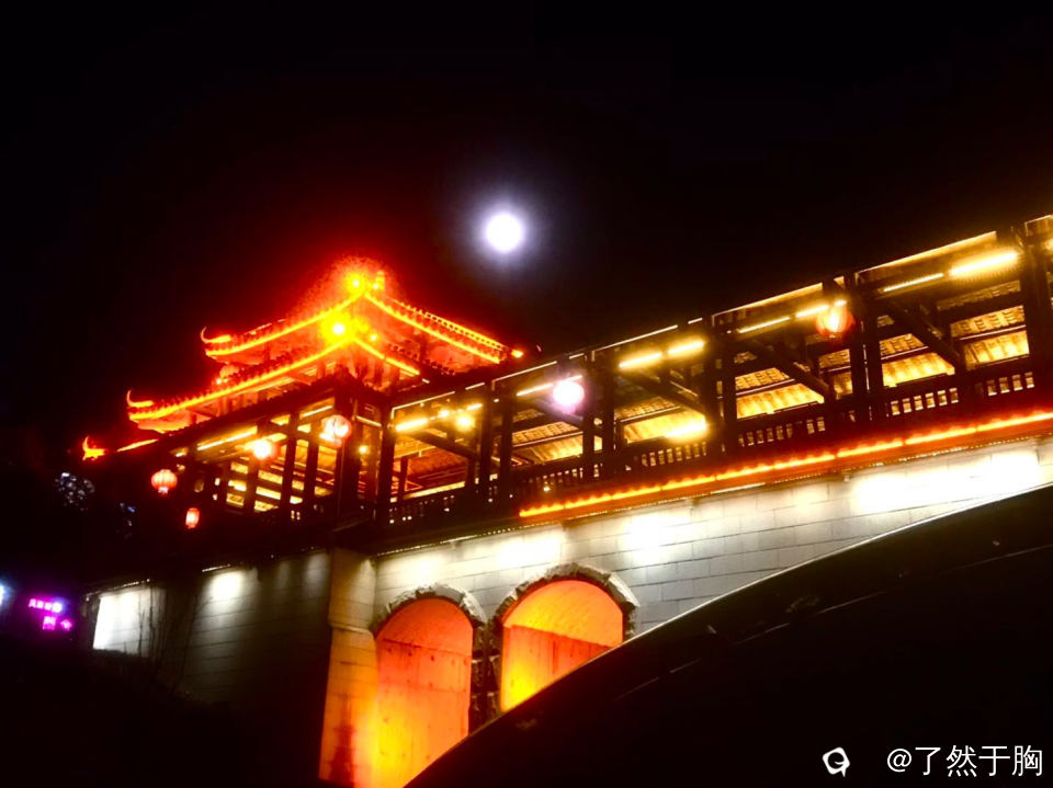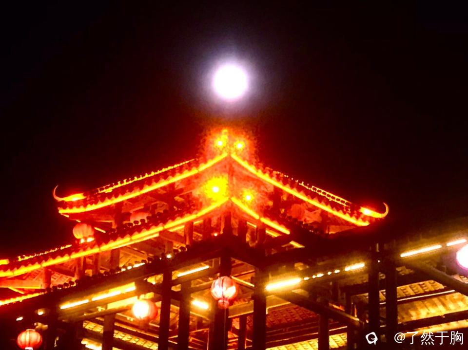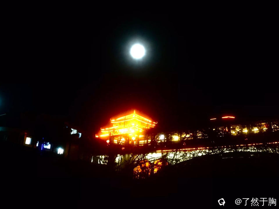 廊桥上,霓虹闪烁,流光溢彩。与天上的圆月相映生辉;月光霓光交融,胜似仙境。