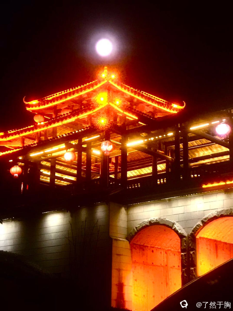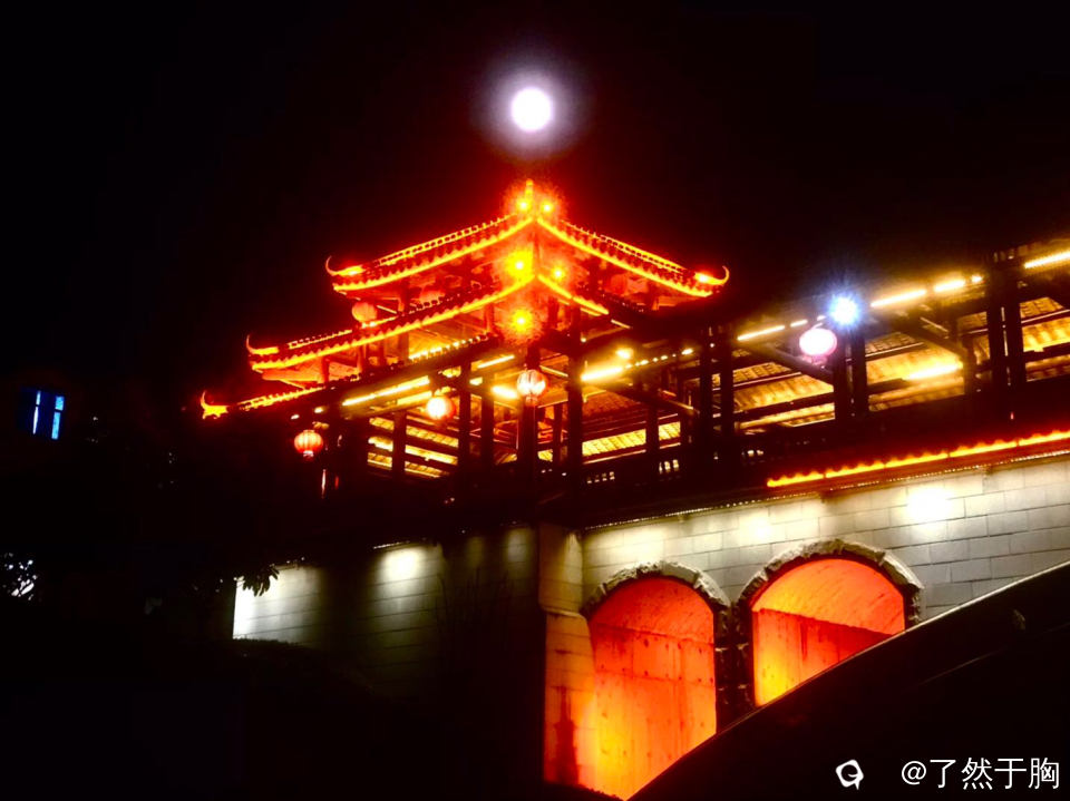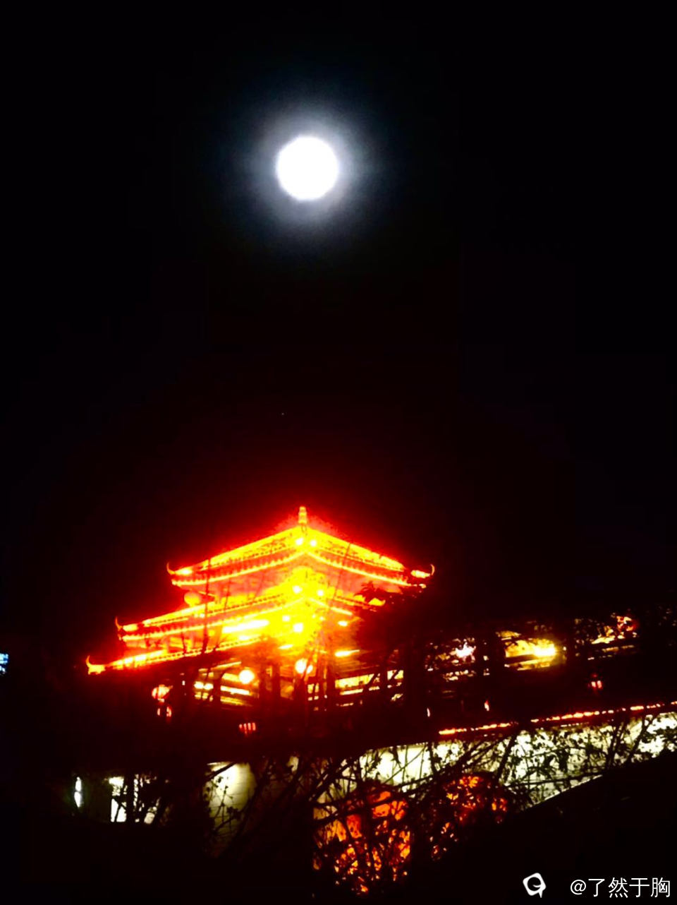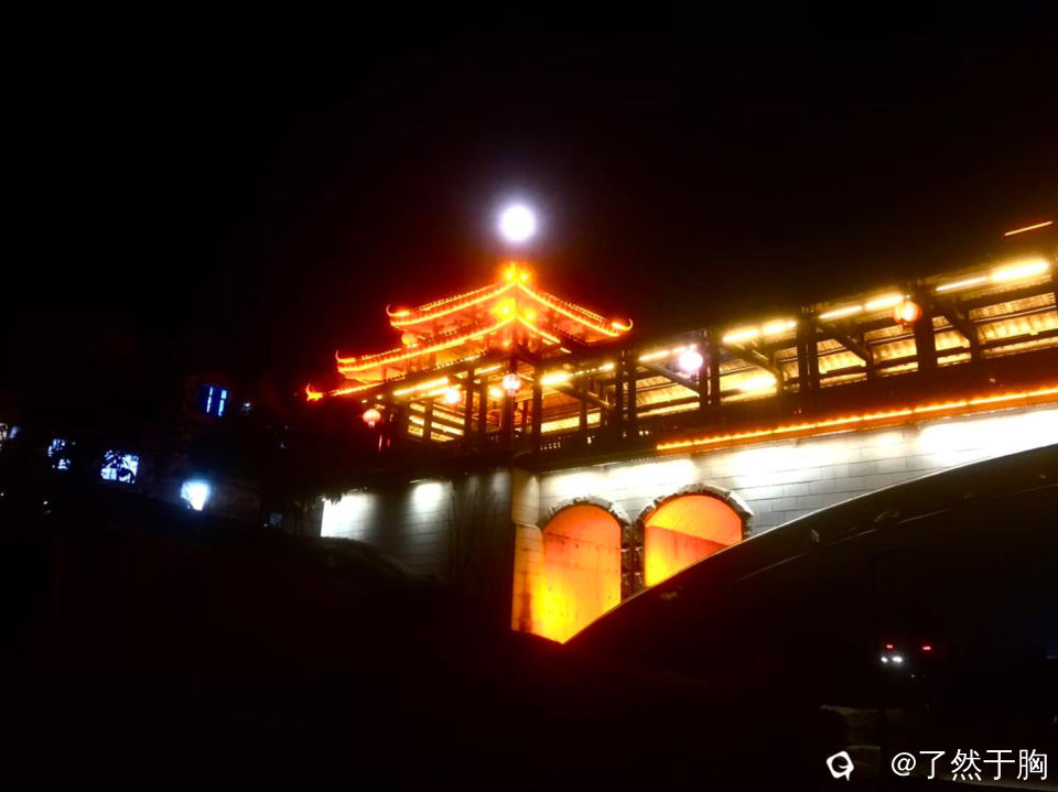 廊桥上,霓虹闪烁,流光溢彩。与天上的圆月相映生辉;月光霓光交融,胜似仙境。