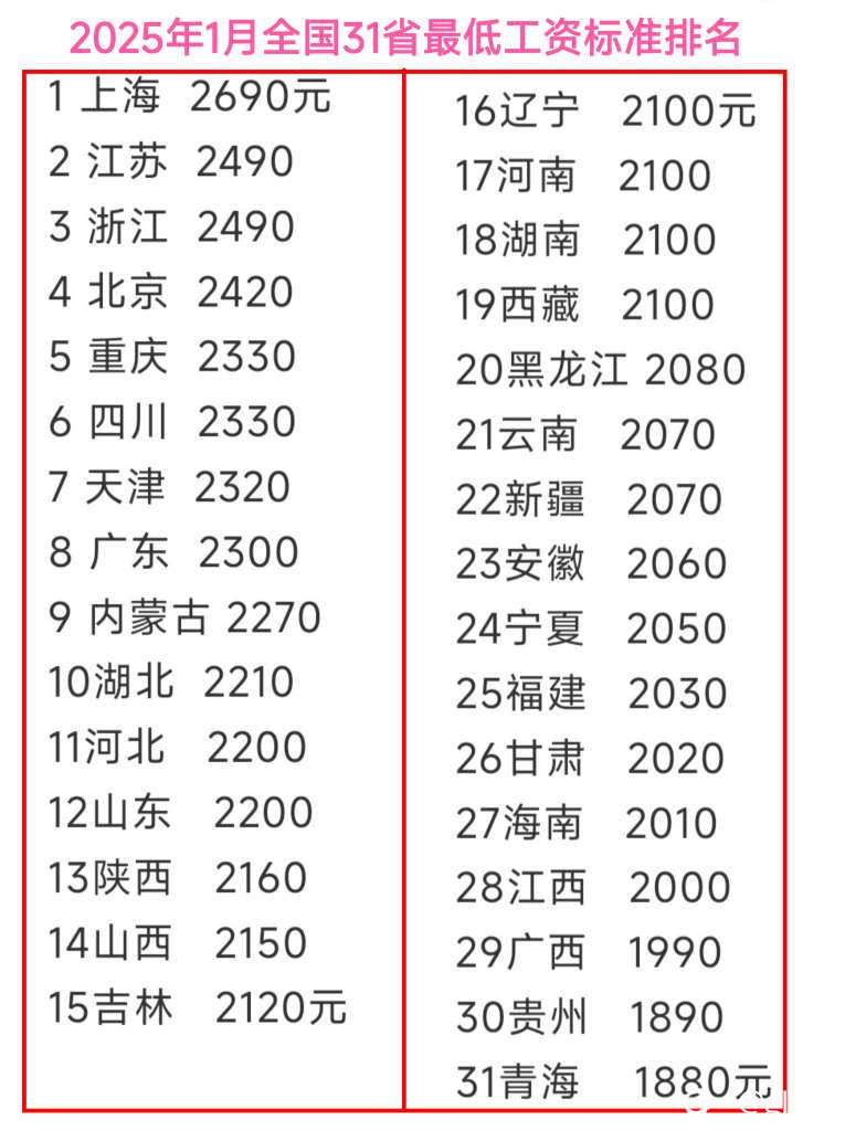 2025年1月人社部公布31个省市的月最低工资标准,最高上海江苏浙江,最低广西贵州青海,广西1990元