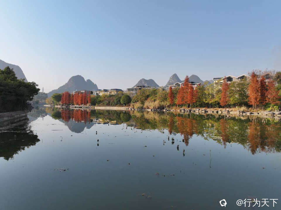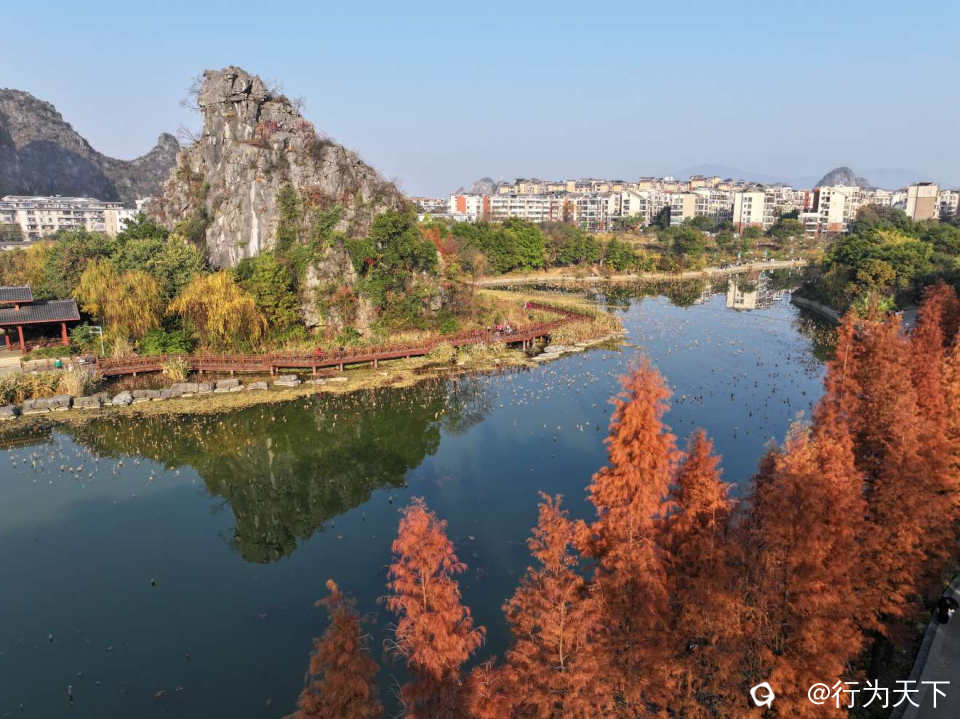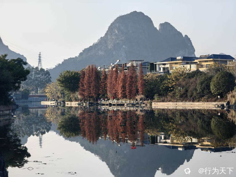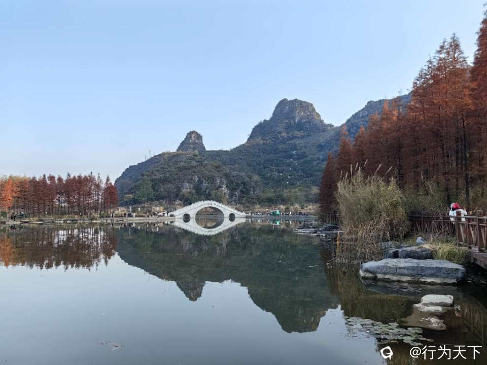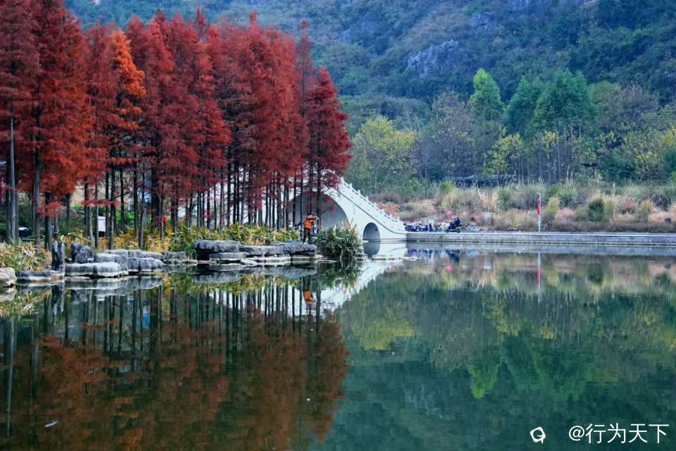 桂林桃花湖景公园的水杉红了,状元桥与水杉林倒影绝美,你确定不来打卡吗?这里不需要门票,停车方便。
