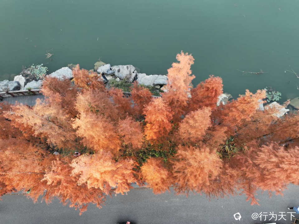 身临水杉林,仿佛置身于一个神奇的红色世界,高耸的水杉直指天空,树影婆娑,给人一种宁静而深远的感觉。