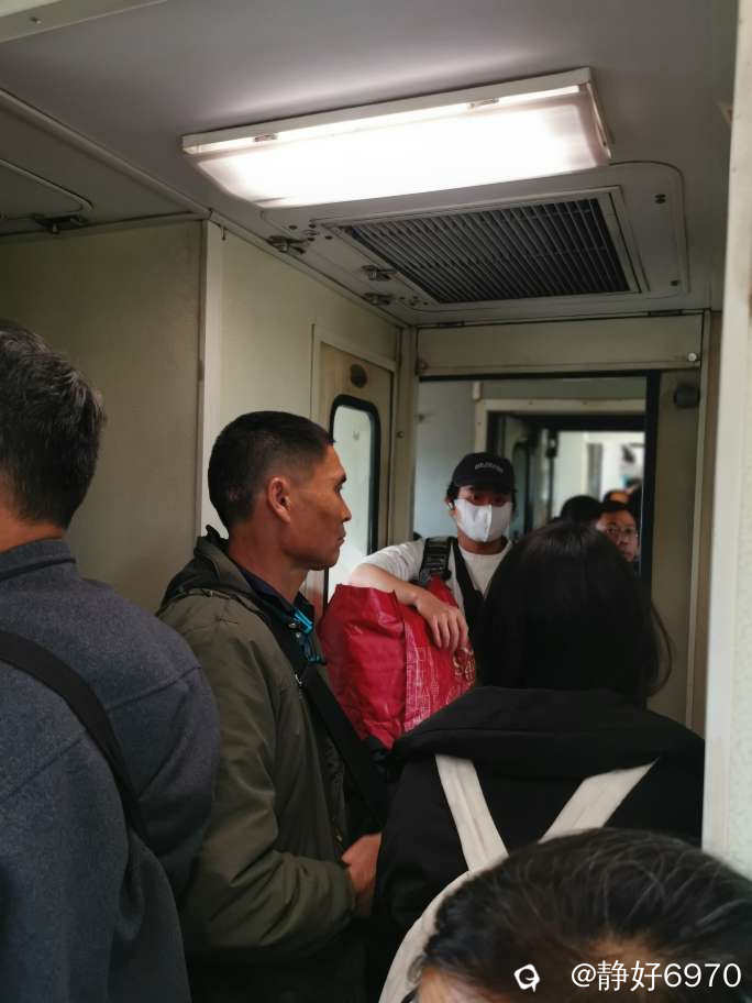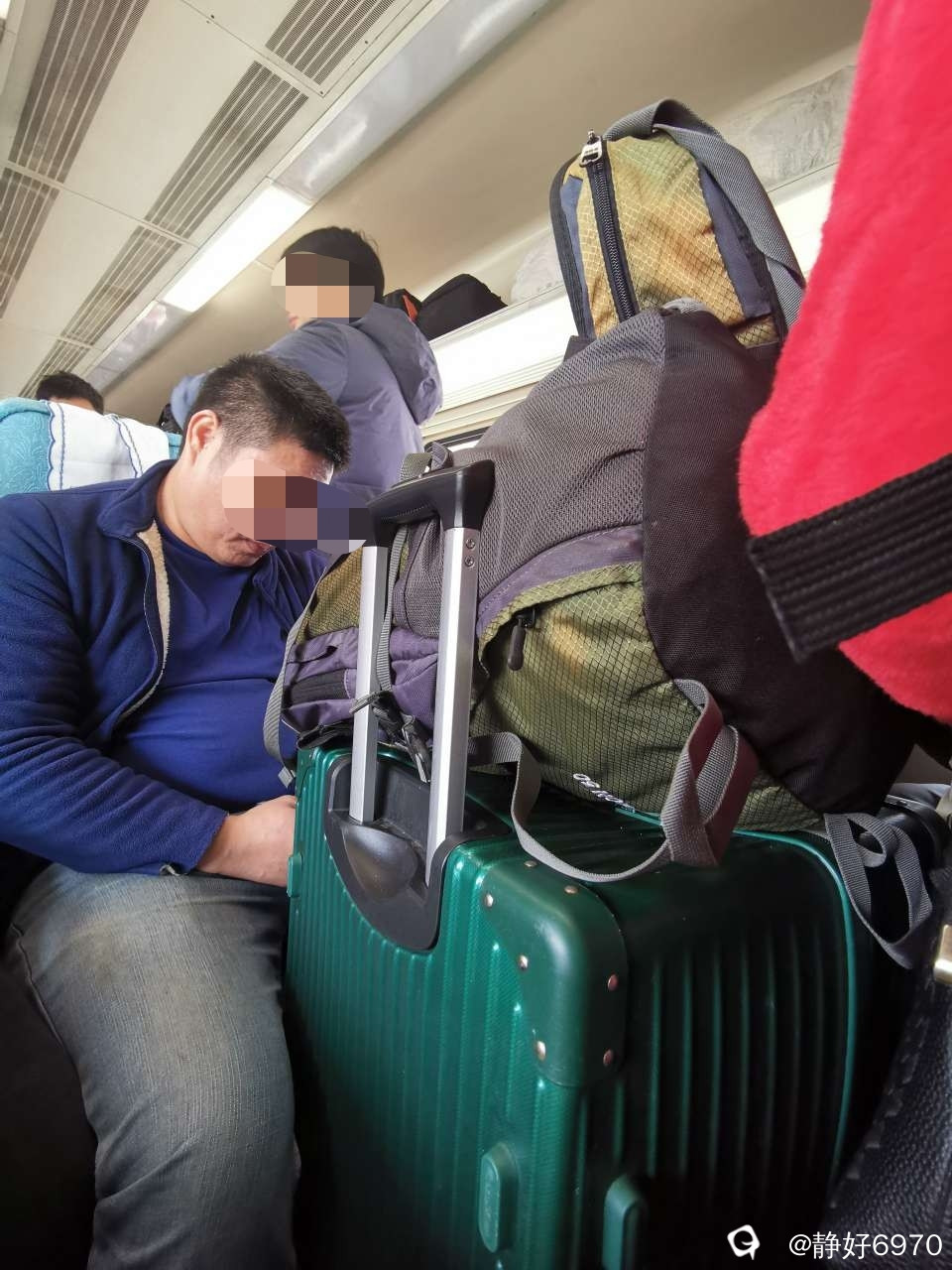 回头一看,车厢连接处也堆满了行李箱,也站的密密麻麻,还好我运气好,有个座位坐着,不然我带来的折叠板凳都不知道摆哪里?看到这样的情景,顿时让我回忆起以前来桂林读书的时候,列车员根本无法打开车门,是父亲硬把我从窗户塞进来的,就算进到车厢里,都是人挤人,甚至是金鸡独立的姿势,就连厕所也被人占着,座位的地板上也躺的是人,行李架上也睡的是人,总之是年轻人无法想象的场面,只有上了年纪的人,经历过挤车的人才会明白,才能体会得到当时的情景。