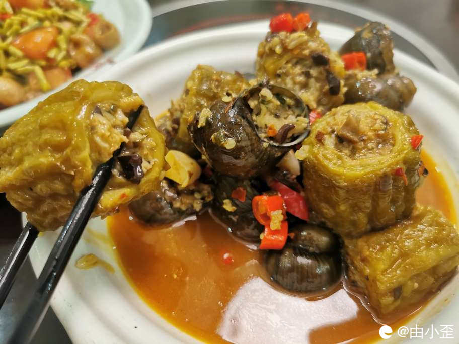 瑶乡双酿,苦瓜酿和田螺酿,都是酿菜中的经典,苦瓜酿好大坨,用筷子比划看看,嘴巴塞都塞不住。