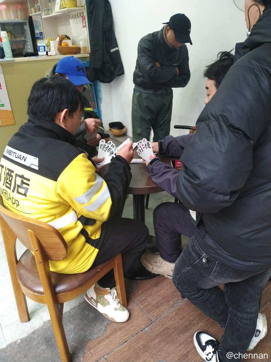 一帮外卖小哥,忙中偷闲打起了字牌,旁边一位同事问他们打多大的,他们说打十块的,这位同事直呼打这么大呀!看来这过年过节,收入高打牌也要刺激点才行。