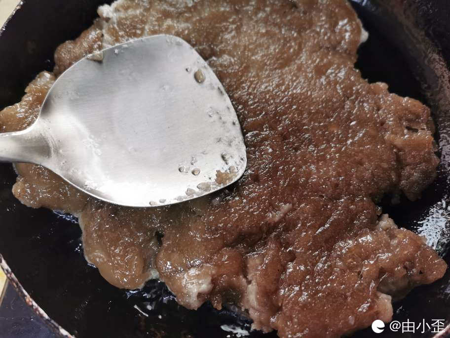 用铲子轻轻拍打,把粑粑里面的气泡敲出来。