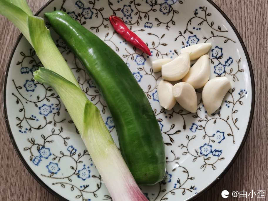 在放凉红薯粑粑的同时,准备好蒜米、干辣椒、青椒、算子(大葱)。