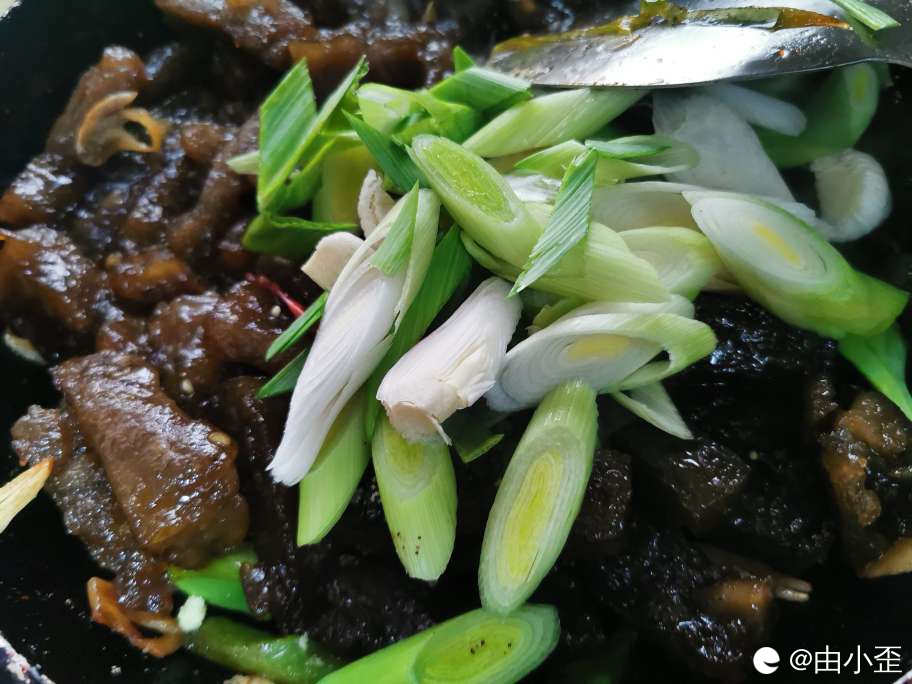 炒呀炒,最后放算子(大葱)和鸡精。