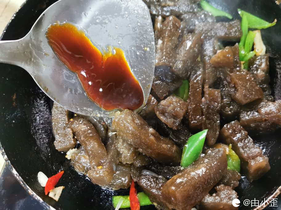 生抽、蚝油、几勺盐、胡辣椒,依次入锅。
