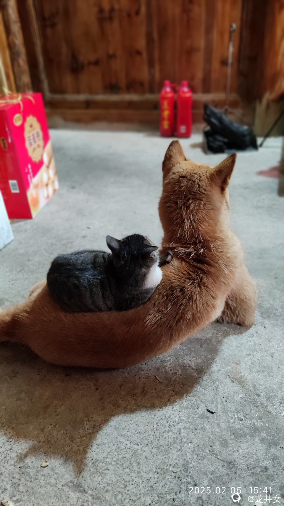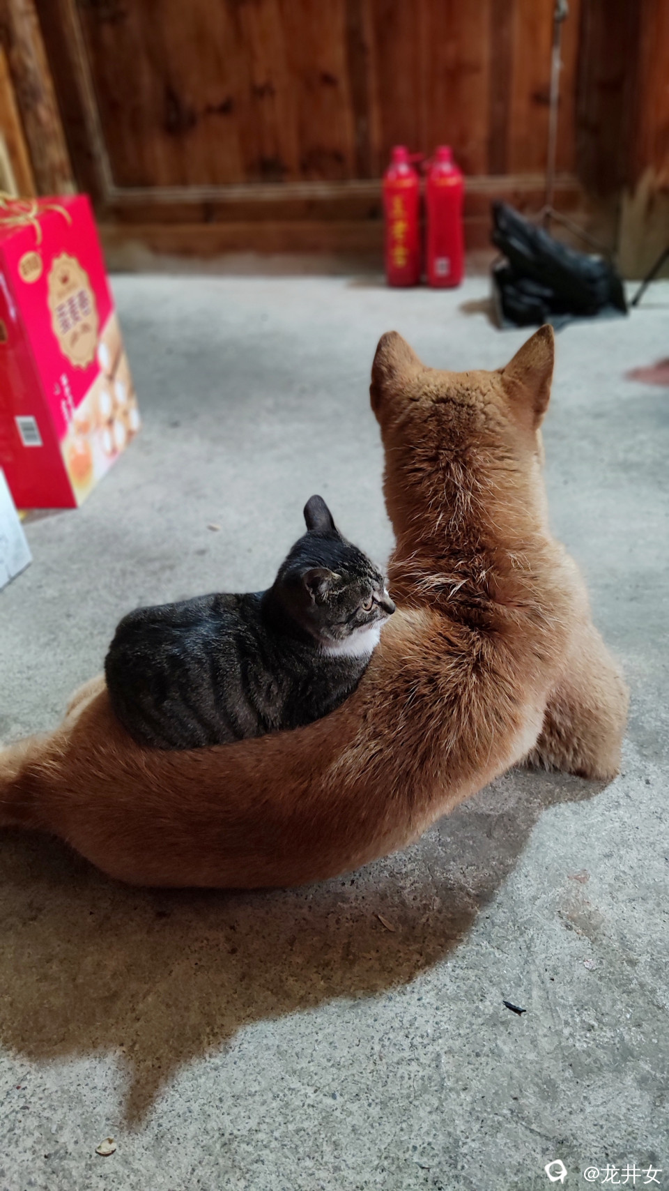 初八拜年,朋友家的猫狗和谐吧,猫坐在狗身上,悠哉悠哉!以前,狗拿耗子多管闲事,现在成小伙伴了。