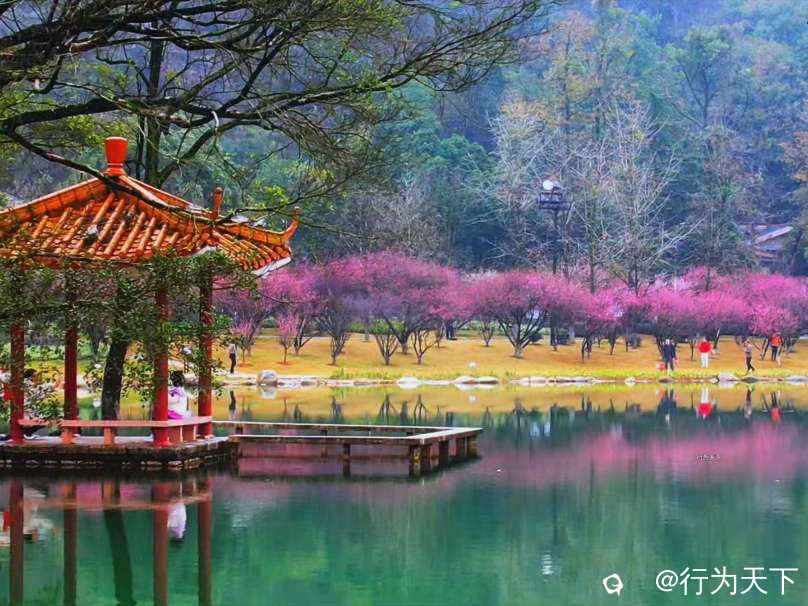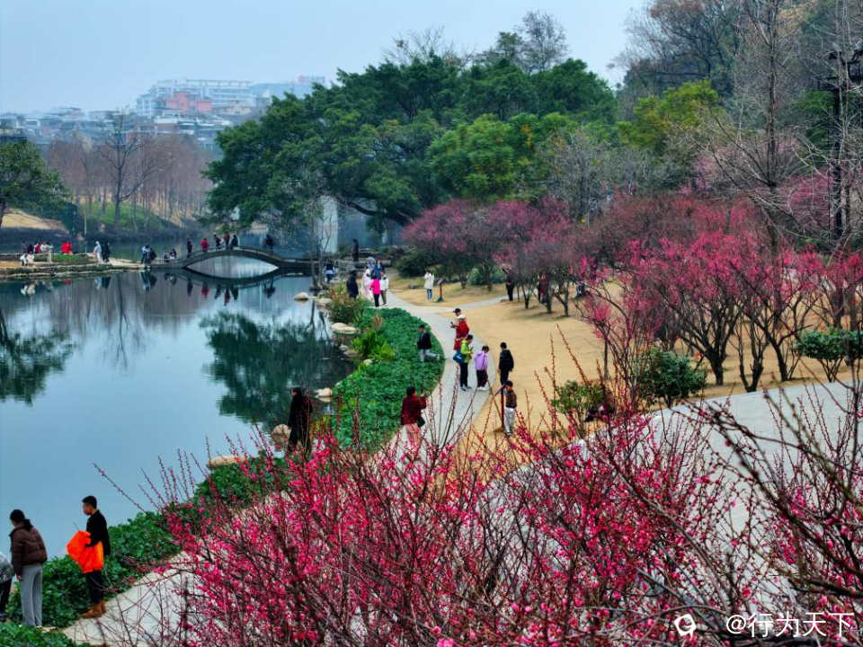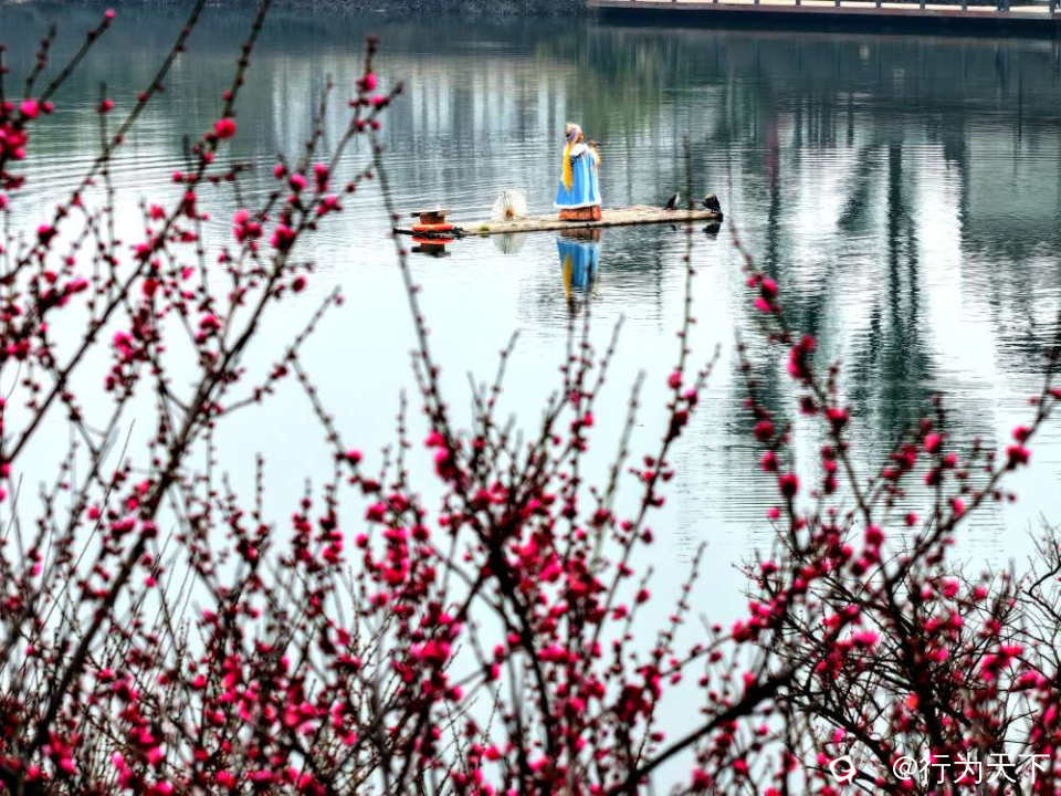 秀美的山峰、艳丽的梅花、清澈的江水、起伏的曲桥、轻摇的小舟构成一幅美丽的画卷,人群倒映江面,徜徉花海中,尽情赏梅留影,畅享“舟行碧波上、人在画中游”的人间仙境。