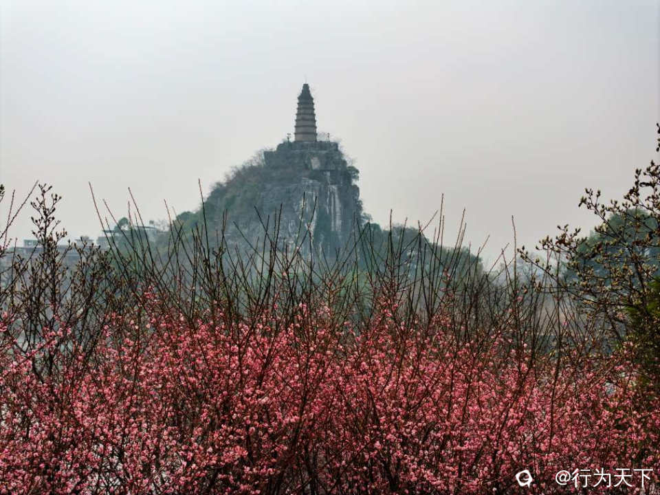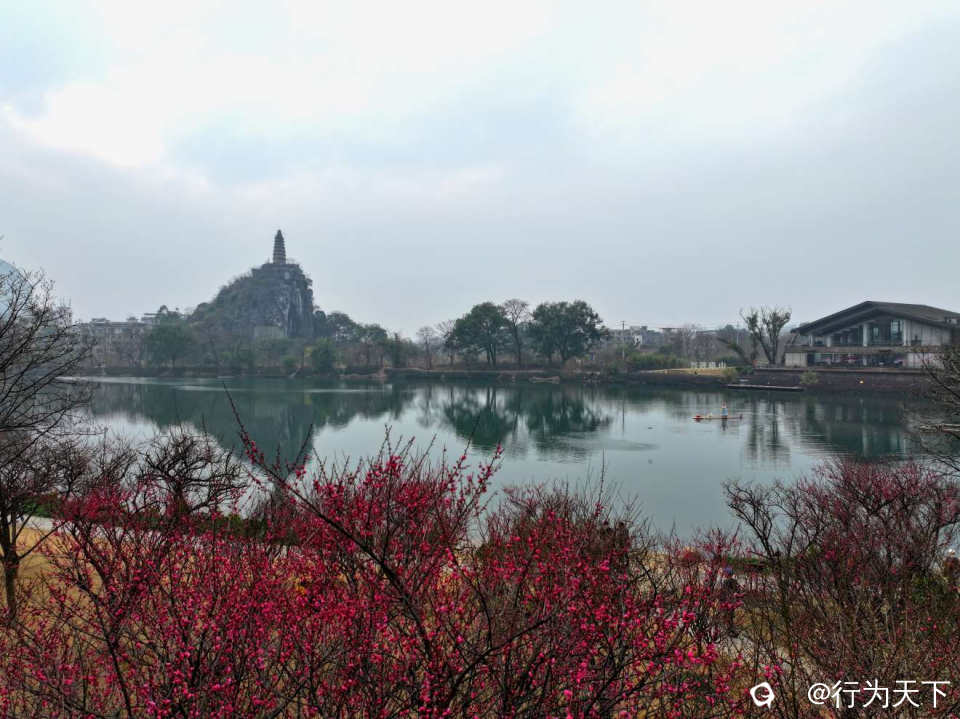 桂林穿山、塔山与蜿蜒的小东江构成了一道靓丽的风景线,静静流淌的小东江水,山与水相映成趣,可谓青山绿水映红梅。