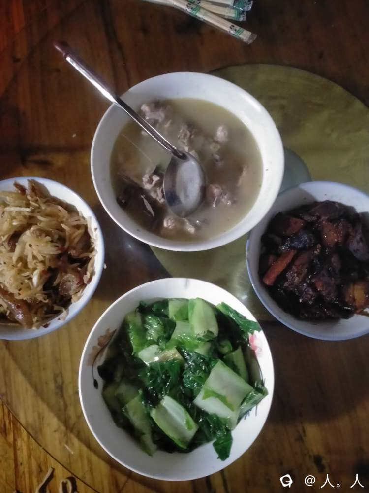 酸萝卜丝炒腊干大肠(这是我在她家厨房挂满了的腊货里挑选的)炒青菜(她家自种的,很甜)一碗炖鸡肉,最后她妈妈还端来了一碗腊肉,说是春节福利。
