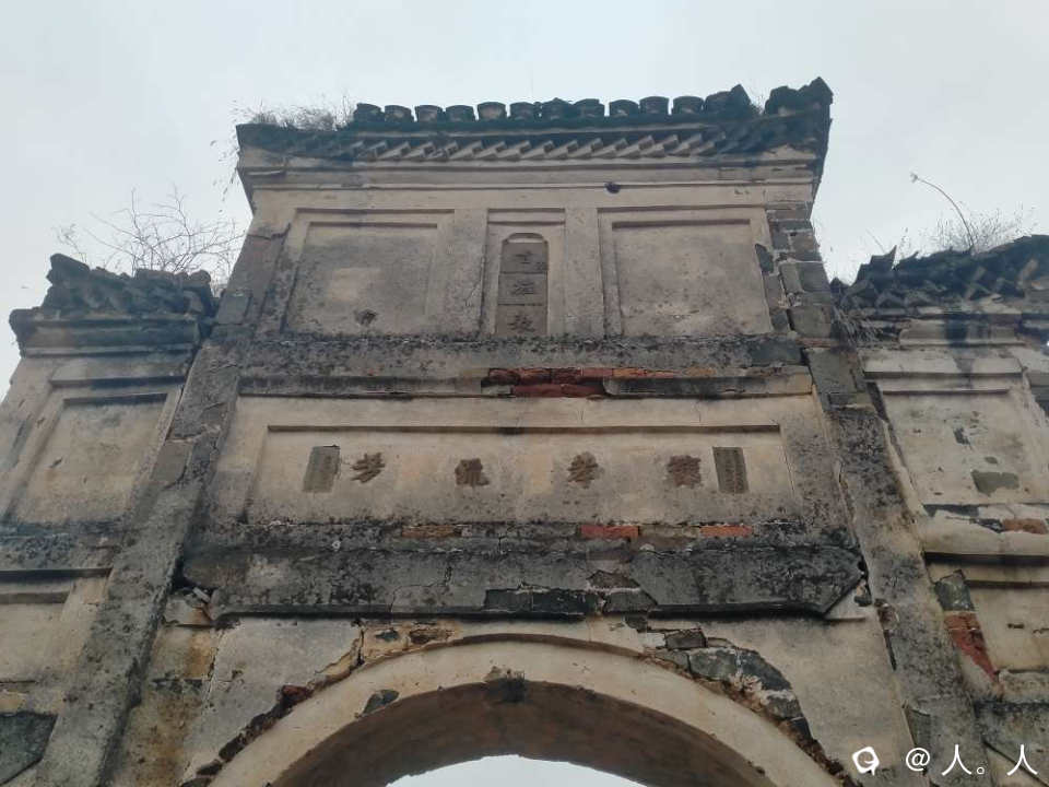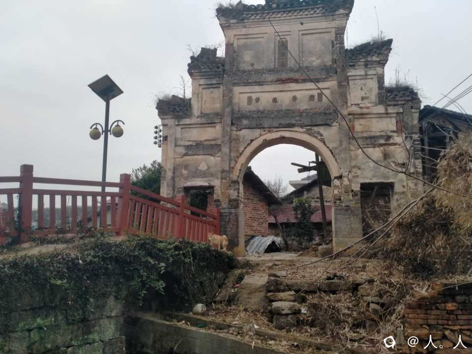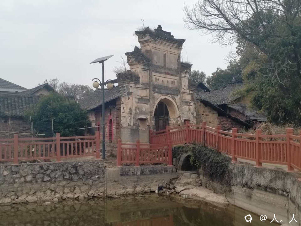 水塘边的乾隆时期节孝坊,砖石结构,坊前有座小拱桥。