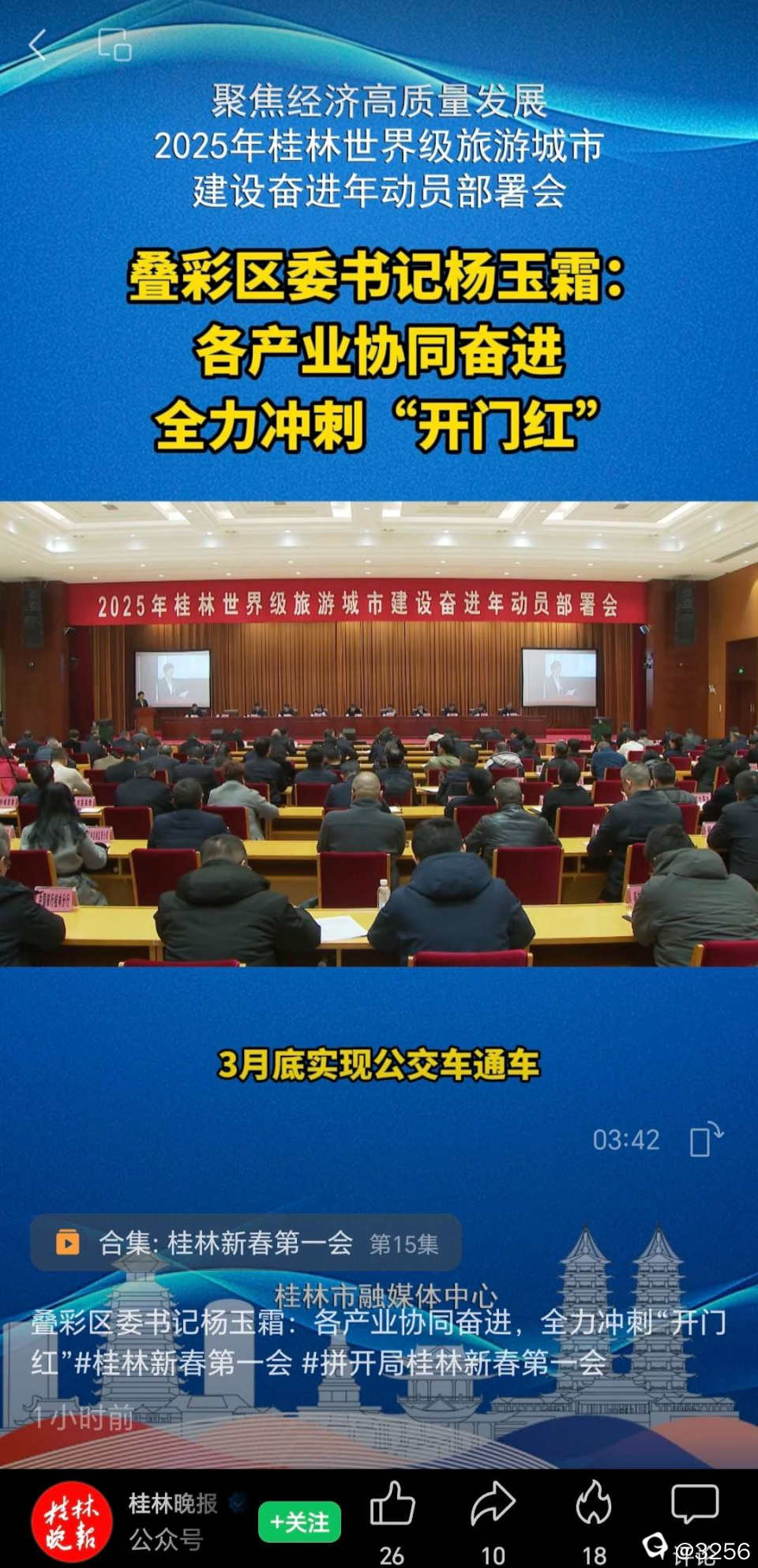 叠彩区区委书记在聚焦经济高质量发展2025年桂林世界级旅游城市建设奋进年动员部署会上发表讲话,称:一季度加快推进桂林医学院附属医院漓东院区配套基础设施建设,3月底实现公交车通车。(完整视频可到桂林晚报微信视频号查看)