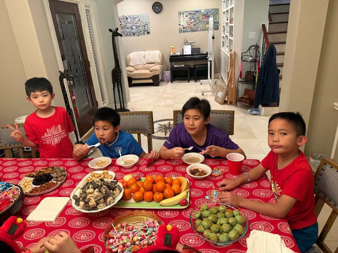 今年的春节,俺女儿和朋友们的聚餐,约在咱女儿家,女儿是主持人啦,估计来了8、9家人,(每一家基本有2~3个小孩,)大大小小几十口吧,很是热闹。按以往的约定俗成,来聚餐的每一家都会带一个自家做的拿手菜来 ,不会做菜的家庭,也会到外面的餐厅买菜带来。作为主持人,聚餐前还需和各家微信联系一下,看各家报的菜肴,若还差啥菜品,就补充。