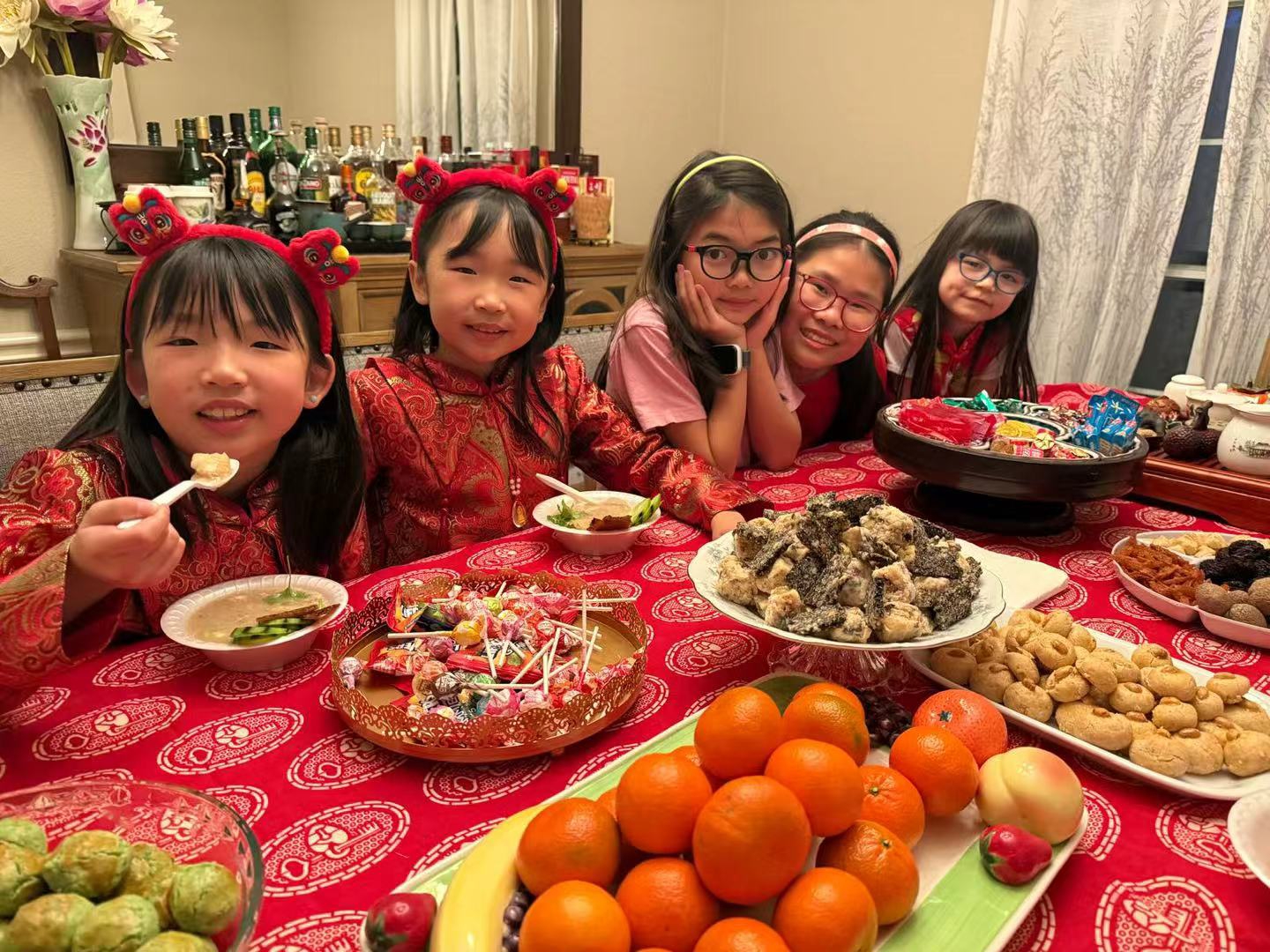 美味佳肴和精美点心配上喜庆桌布,妥妥的中国年。
