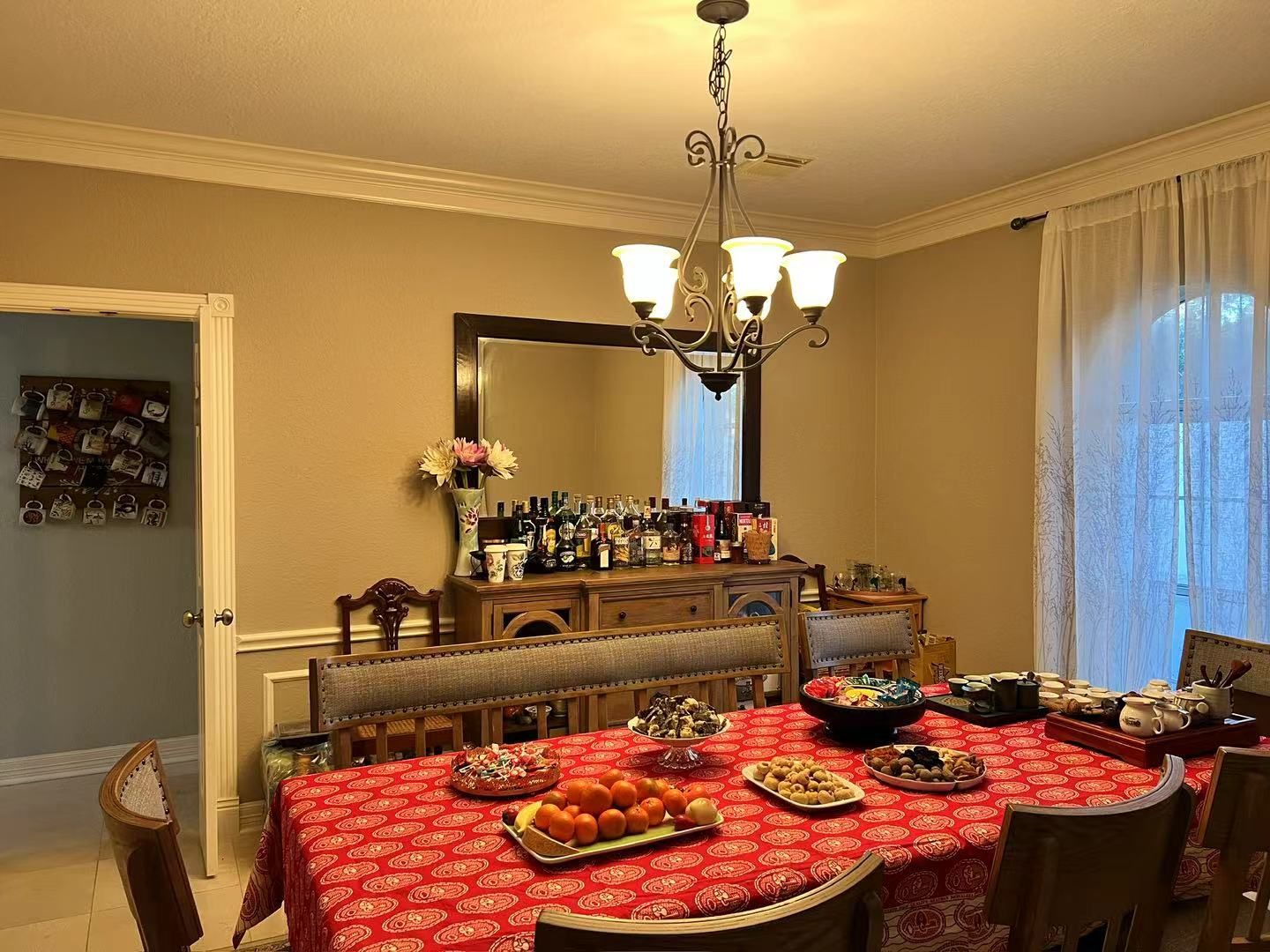 这是咱女儿家的西餐厅,哈!餐桌布是我去年探亲时帮做的,餐桌布颜色蛮喜庆的。