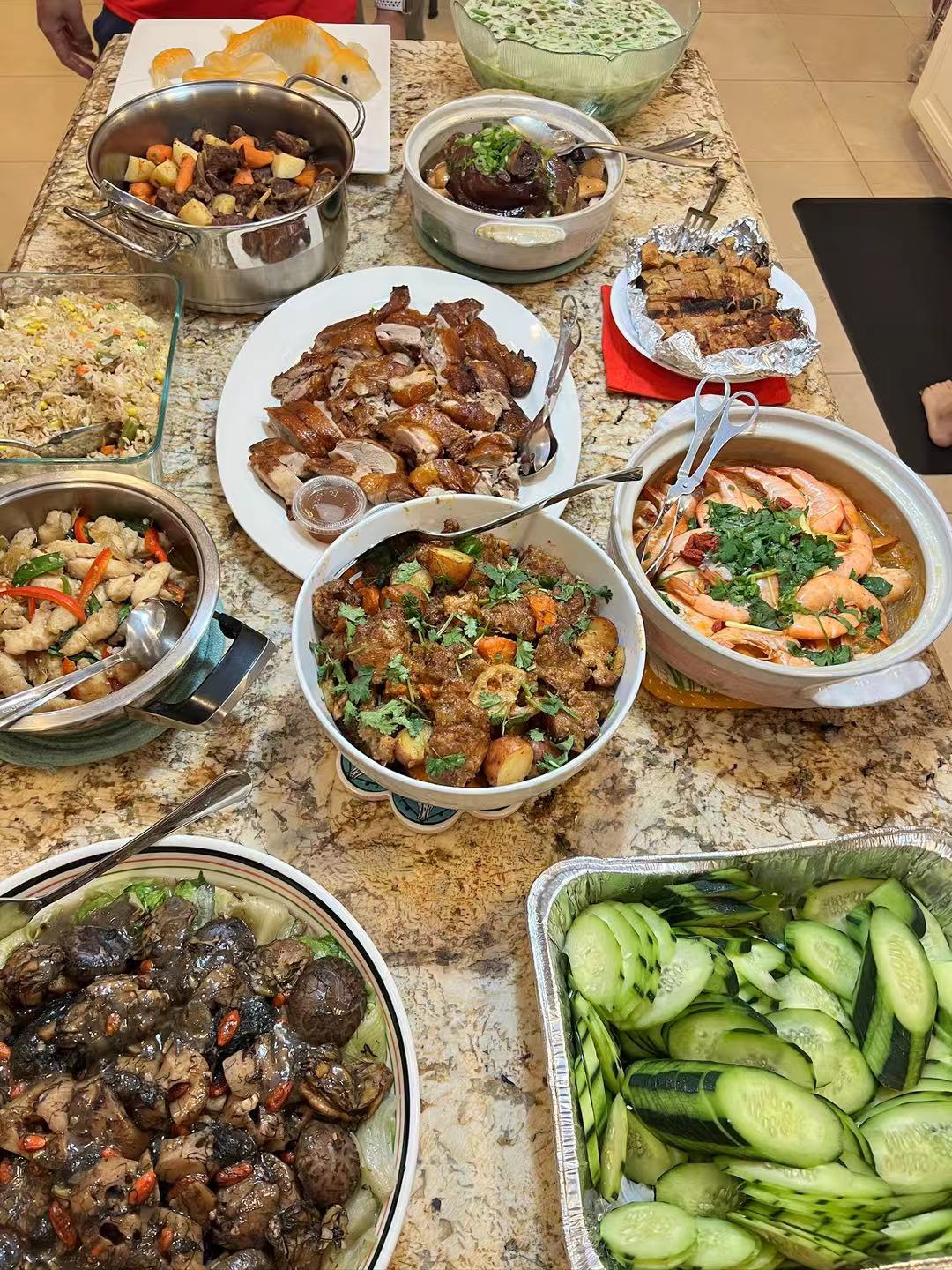 厨房里摆放的朋友们带来的部分菜肴,鸡、鸭、鱼、肉、虾,炒面,粉丝等等,荤素俱全。