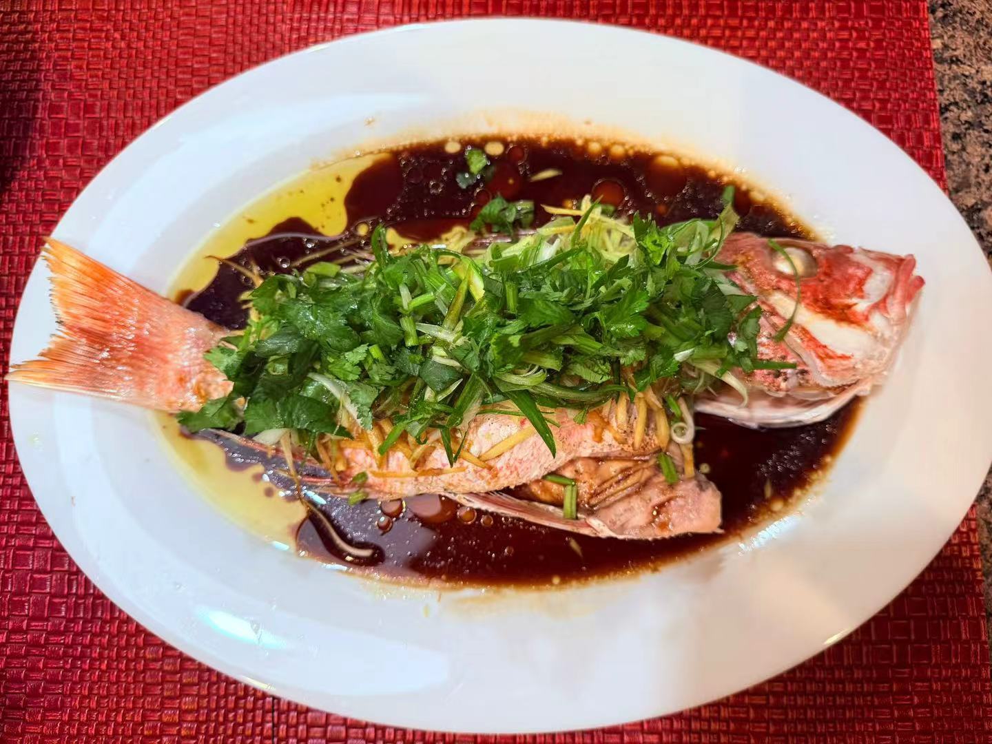 清蒸鱼,估计是哪家朋友自己海钓的鱼。这些朋友中,有几个海钓爱好者,每回聚餐,都会带来自己海钓的鱼。去年的春节聚会时,咱女儿和他们说好了带我去海钓,可总没有合适的天气。或许人家也考虑到对你的安全负责任。