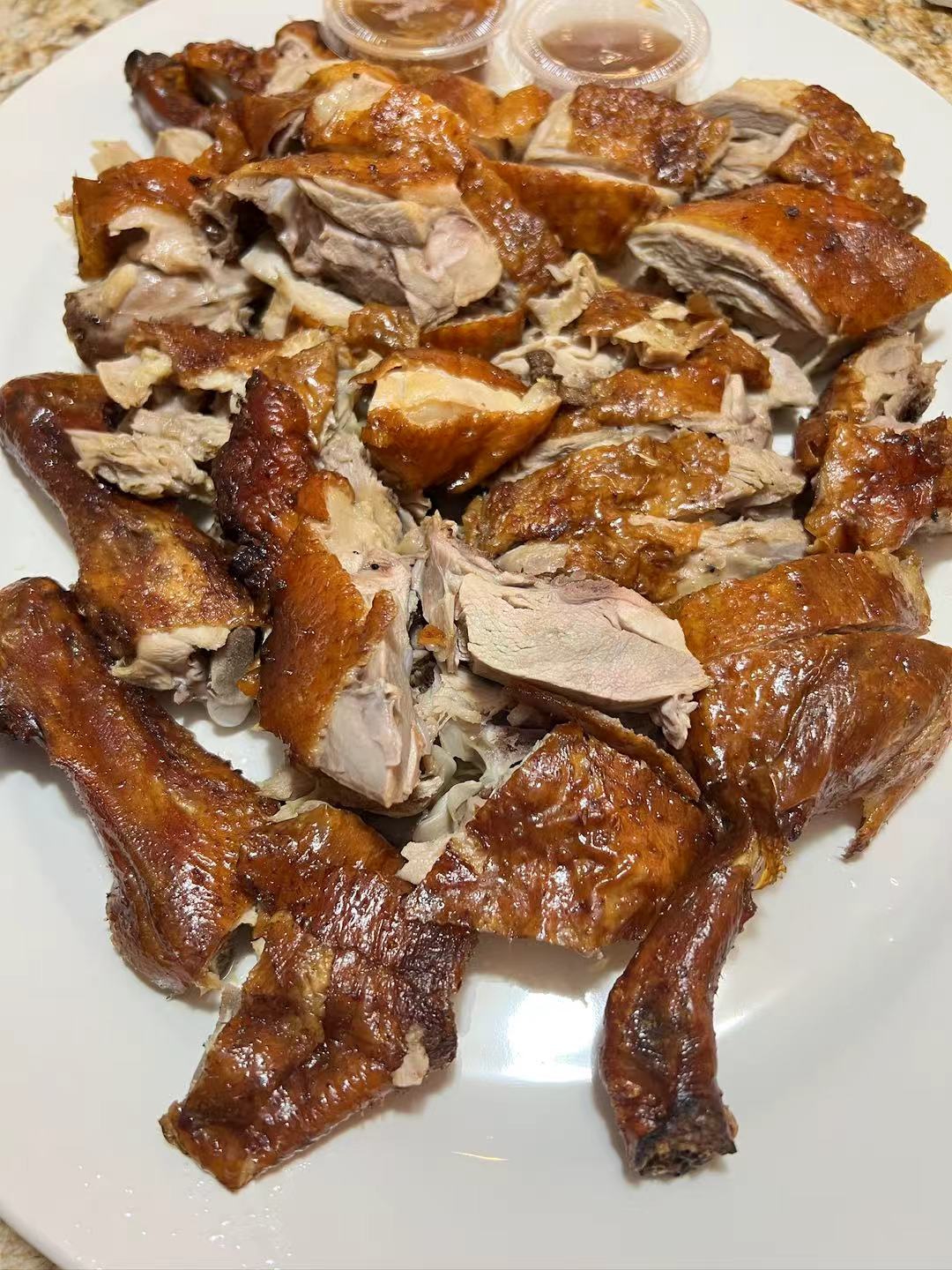烤鸡。此鸡好大只噢。