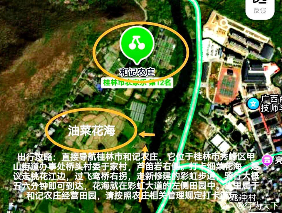 出行攻略:直接导航桂林市和记农庄,它位于桂林市秀峰区甲山街道办事处桥头村委于家村,芦笛岩右侧。打卡细菜花海,建议走桃花江边,过飞鸾桥右拐,走新修建的彩虹步道,骑行大概五六分钟即可到达,花海就在彩虹大道的左侧田园中。