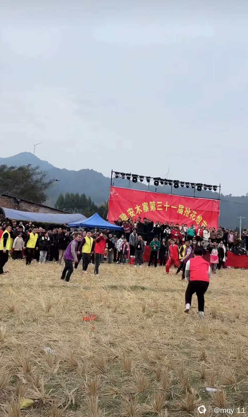 图片为广西融安木寨的抢花炮节,比赛三个颜色的队伍,几十人同场在田里竞技,以抢到花炮带过龙门为胜利。