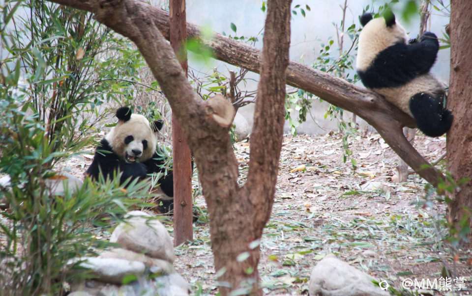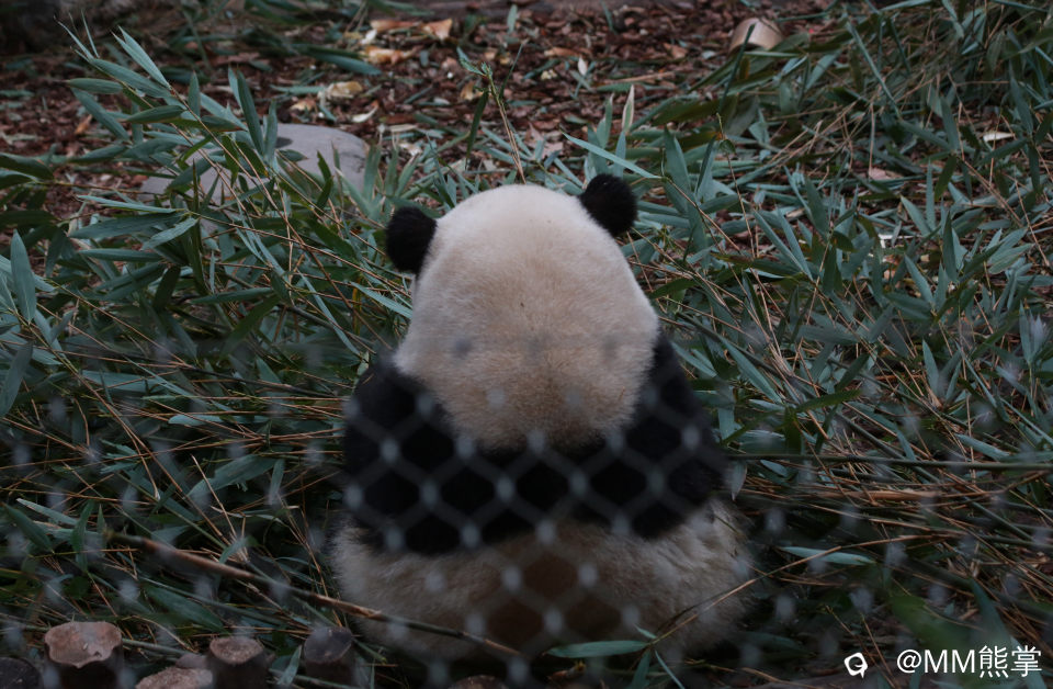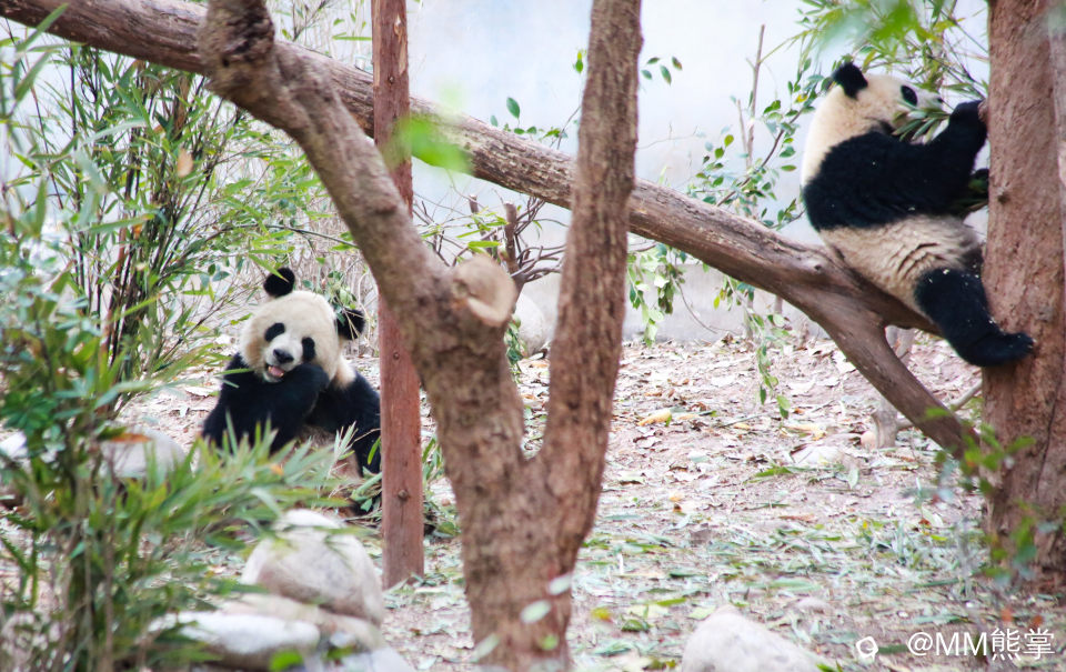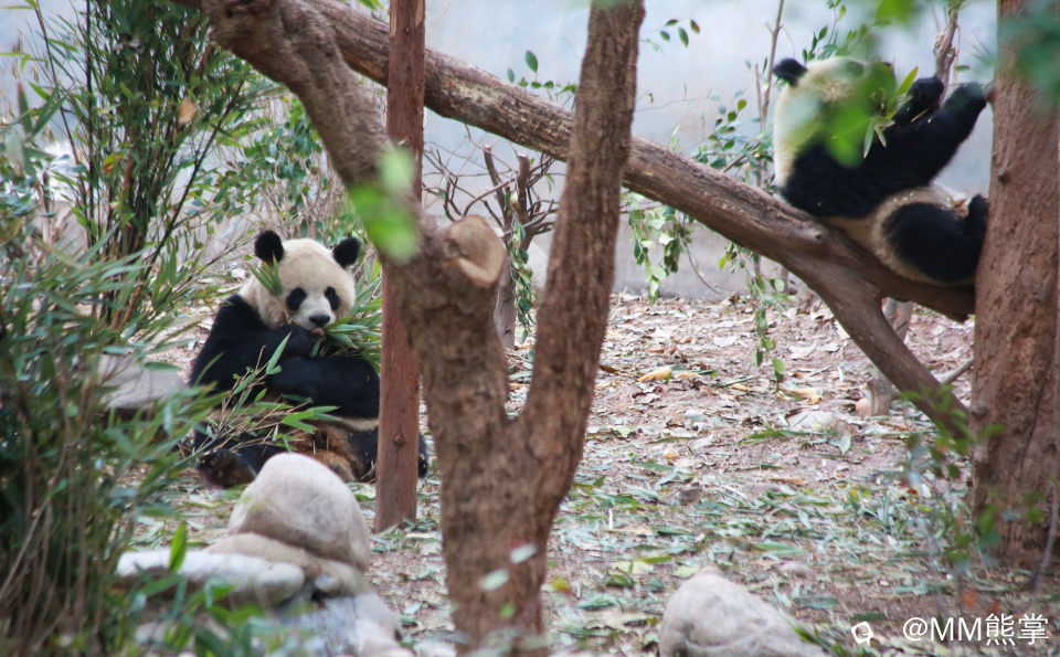 大熊猫园润带两个双胞胎儿子润泽、润洋,润泽和润洋分不太清,有说一个像妈妈园润,称为“迷你润”;一个像姐姐润玥,称为“迷你玥”。母子仨住在2号别墅,院子很大,俺十来米开外拍的,仨熊一起吃竹子,院子里树木丛生,所以拍摄效果不太如人意,但也能感觉到母子仨很快乐,很温馨。