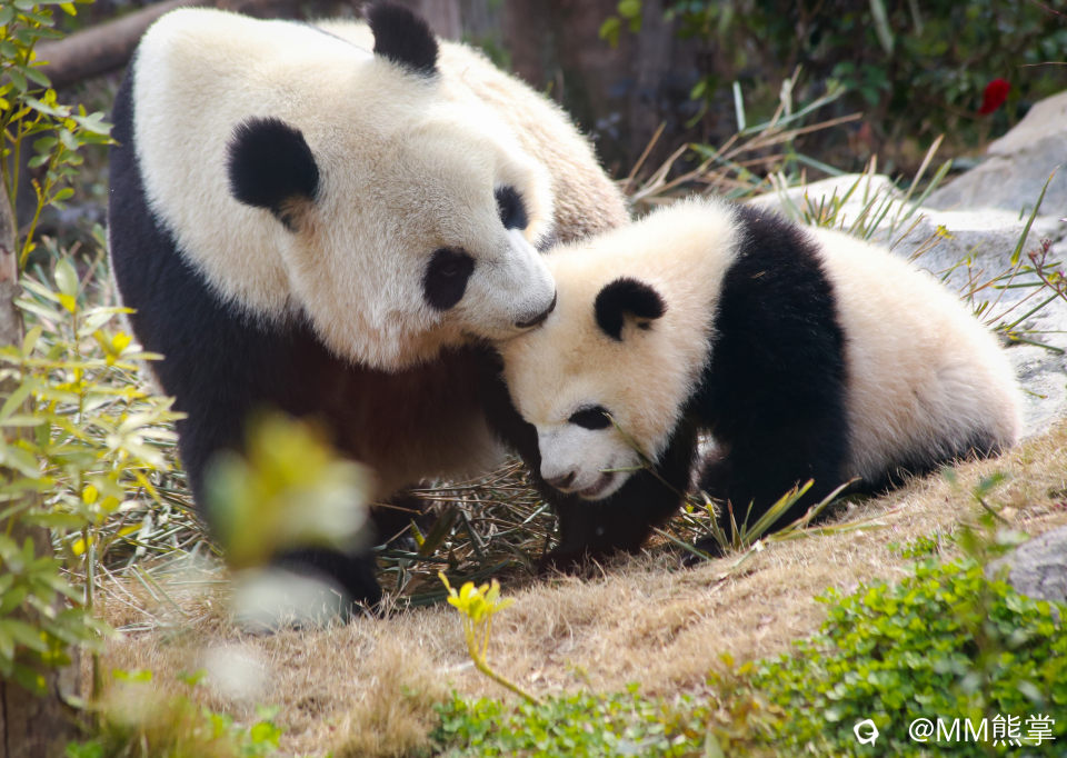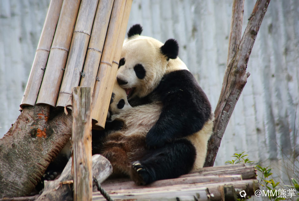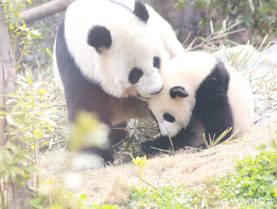 大熊猫淼淼,一直是我想拍摄的对象。因为她是园润的闺蜜,淼淼和园润关系很好,在她们分别的前一天,淼淼好像感觉到两熊即将分别,心情很不好,躲在两熊的秘密基地里难过,园润过来安慰她,还打包竹子给她吃。吃完竹子,两小只就亲密地抱在一起,渡过了最后一天的合班生活。自此分开生活,两姐妹再也没有机会聚在一起。不过后来园润的大闺女润九是淼淼帮带大的。淼淼是位温柔的妈妈,润九怎么折腾她都不生气。现在淼淼又当妈妈了,带自己的崽崽金瑞。我蹲守了好几天才拍到淼淼带崽。