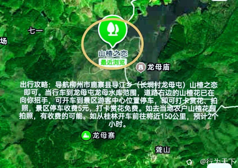 出行攻略:导航柳州市鹿寨县导江乡(长垌村龙母屯)山楂之恋即可。当行车到龙母屯龙母水库范围,道路右边的山楂花已在向你招手,可开车到景区游客中心位置停车,即可打卡赏花、拍照,景区停车收费5元,打卡赏花免费。如去当地农户山楂花园拍照,有收费的可能。如从桂林开车前往约150公里,将近2个小时。