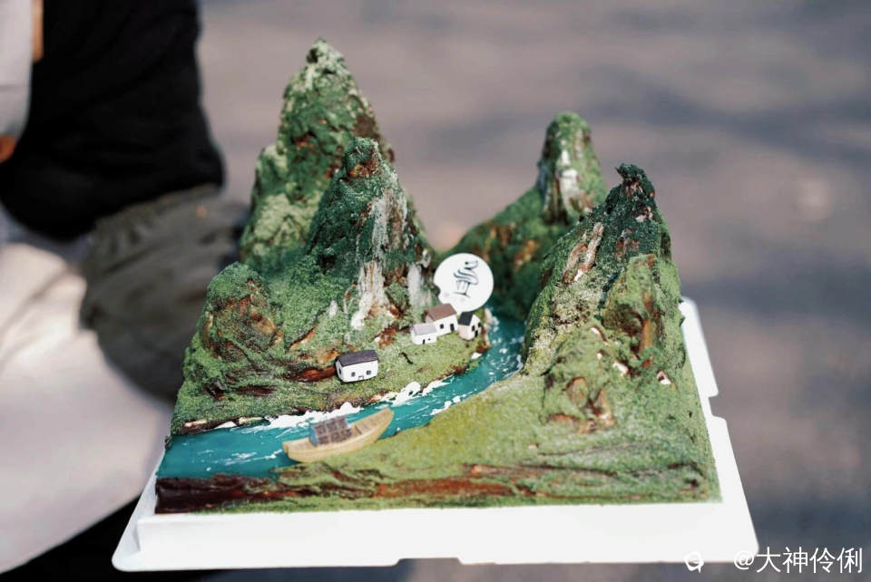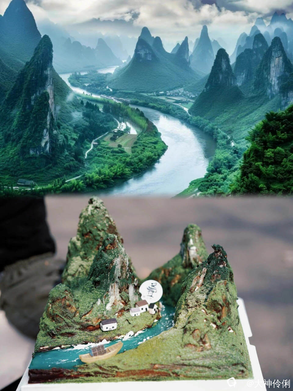 在网上看到了一位蛋糕达人做的微景观蛋糕,还是桂林山水蛋糕,你别说做得还挺漂亮,虽说绿意没那么足,但还做得挺传神。