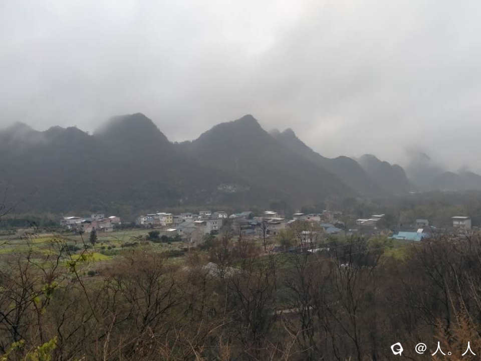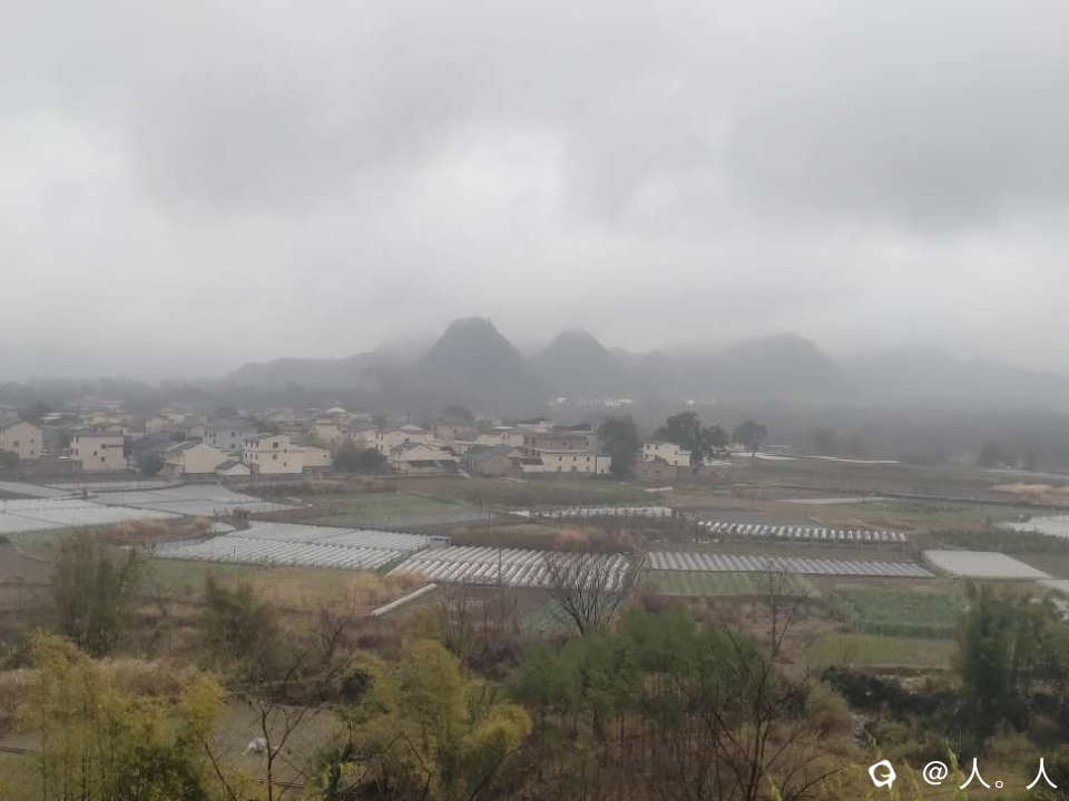远看雨中明村