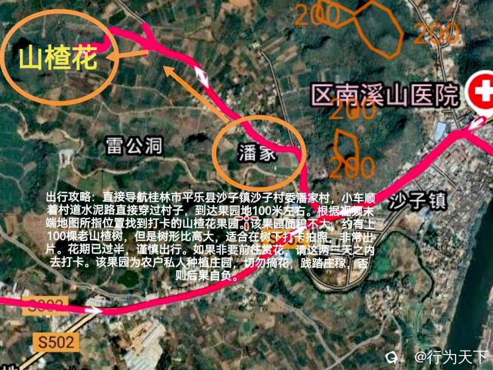 出行攻略:直接导航桂林市平乐县沙子镇沙子村委潘家村,小车顺着村道水泥路直接穿过村子,到达果园地100米左右。根据视频末端地图所指位置找到打卡的山楂花果园。