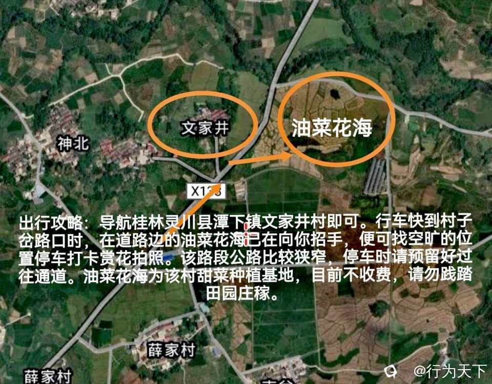 出行攻略:导航桂林灵川县潭下镇文家井村即可。行车快到村子岔路口时,在道路边的油菜花海已在向你招手,便可找空旷的位置停车打卡赏花拍照。