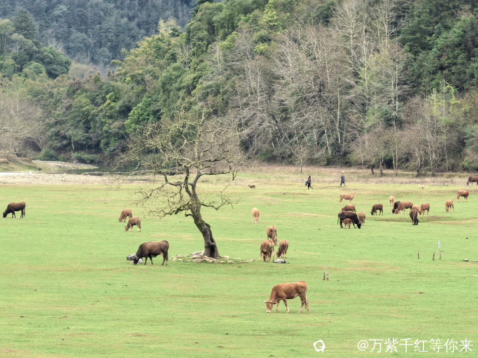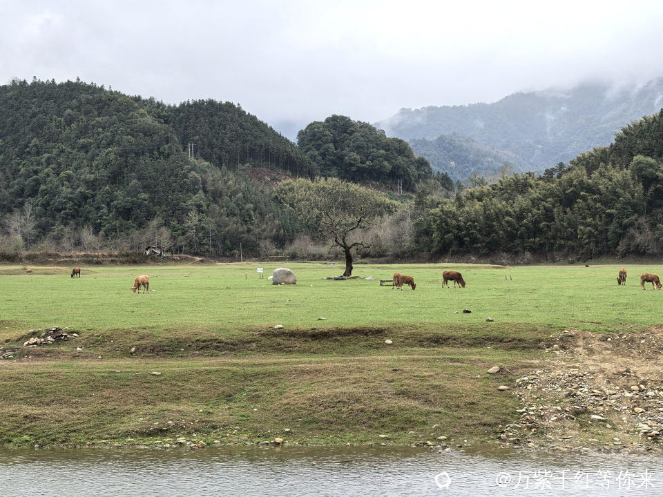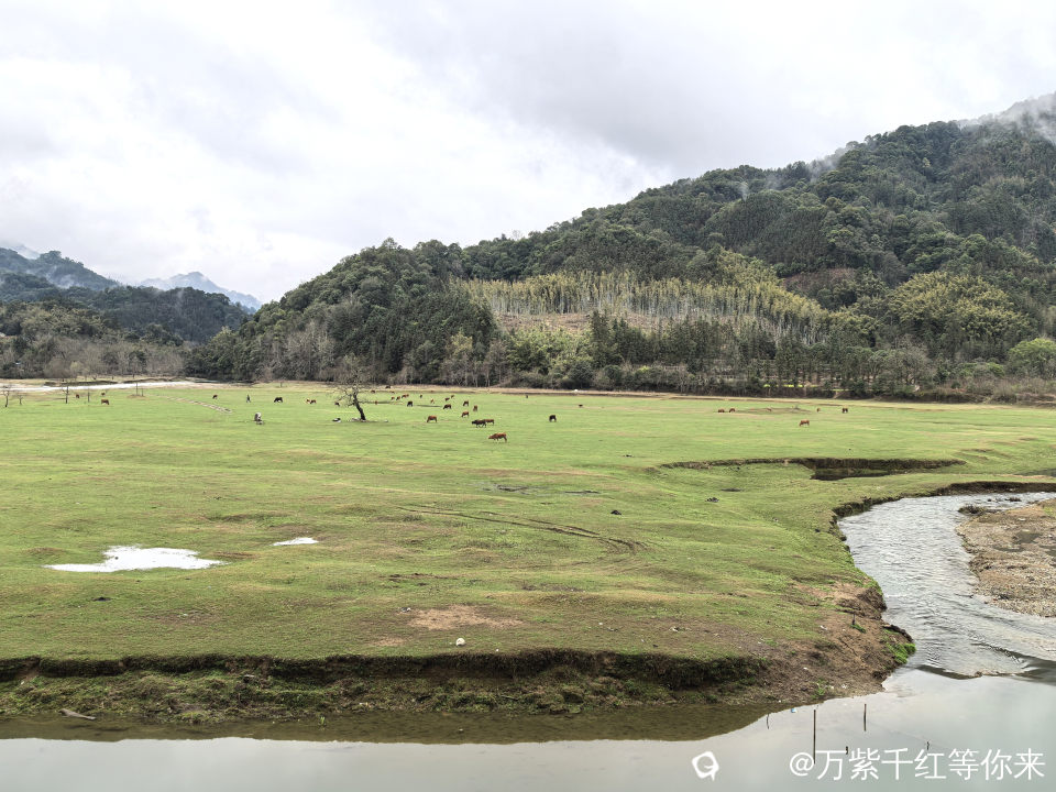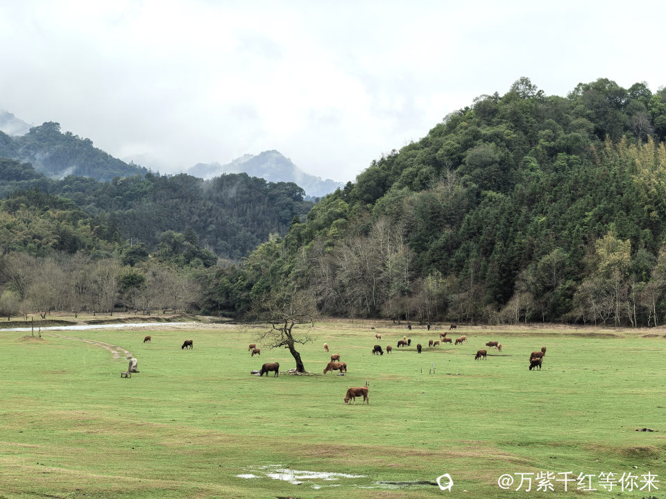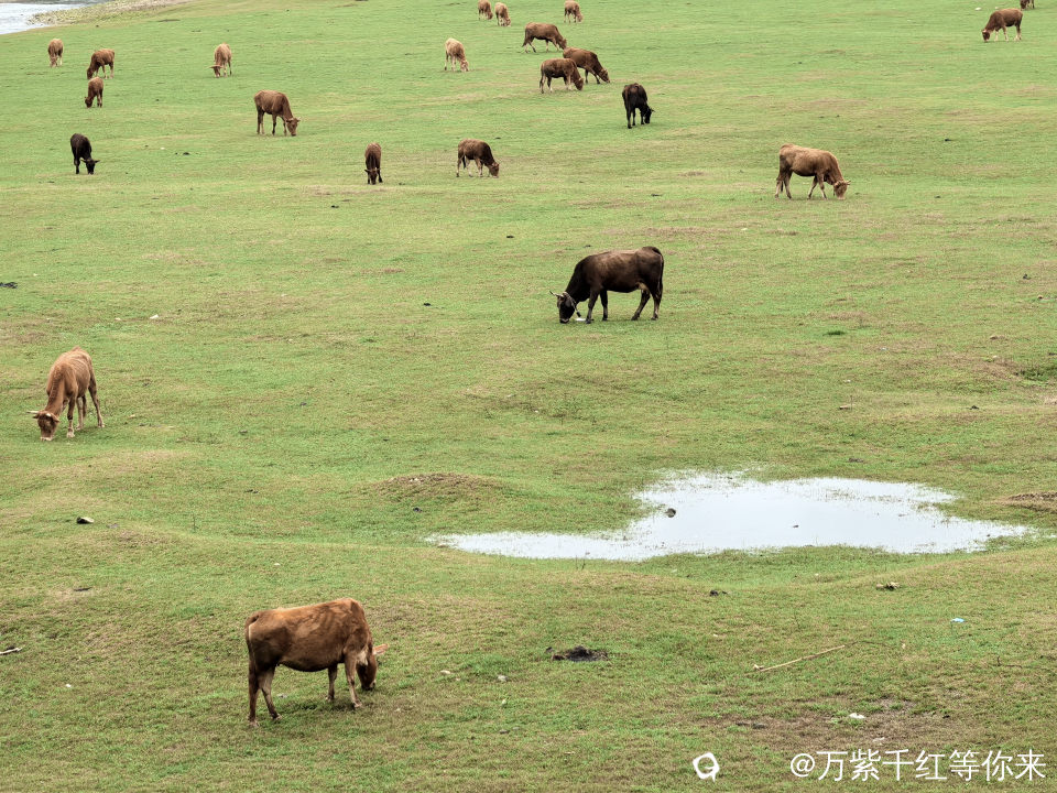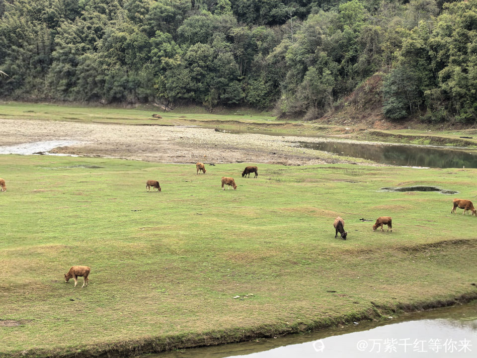 宽阔的大草地,绿水青山环绕;成群的牛儿在悠闲吃草;远处绵延的山脉及茂盛的树林,与绿意盈盈的大草坪,共同描绘出一幅动人的自然风光。