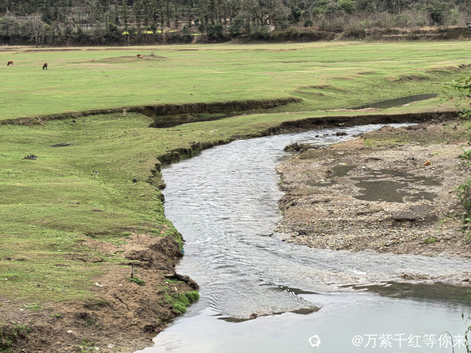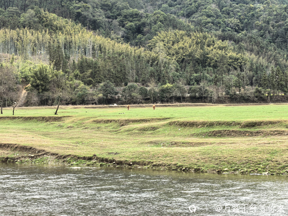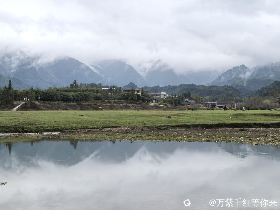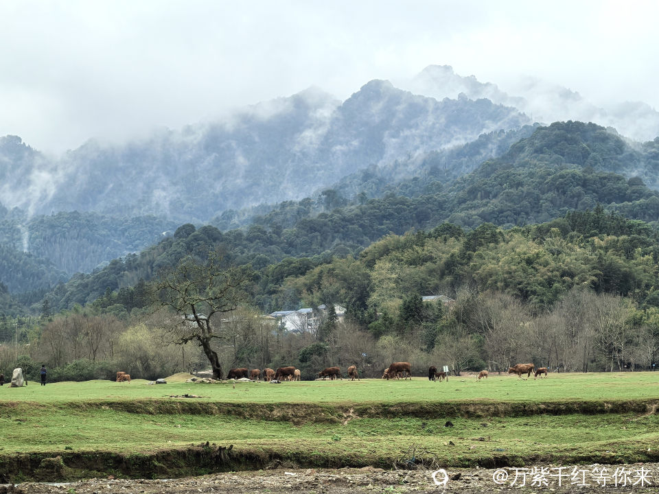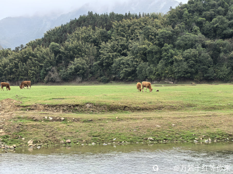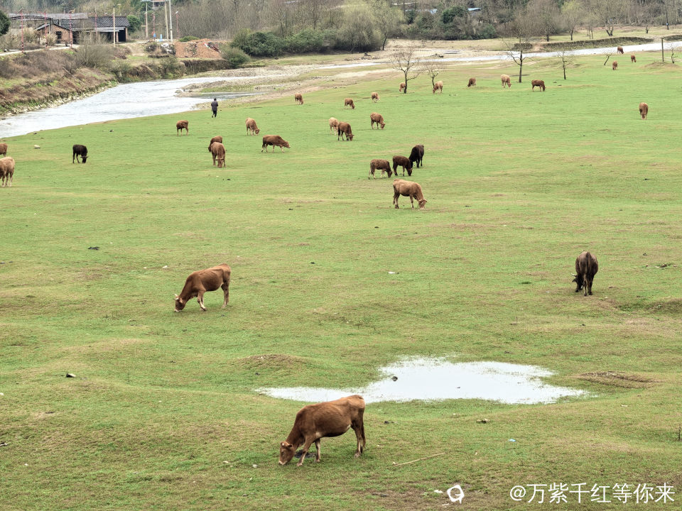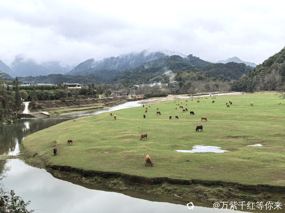 宽阔的大草地,绿水青山环绕;成群的牛儿在悠闲吃草;远处绵延的山脉及茂盛的树林,与绿意盈盈的大草坪,共同描绘出一幅动人的自然风光。